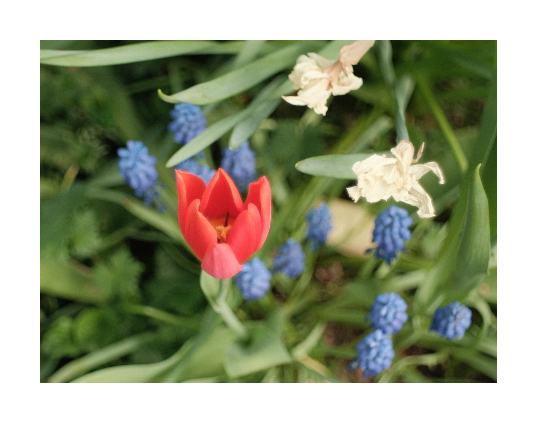 Das beste Foto des Tages kommt gleich zu Beginn zustande, als ich das Büro verlasse. Für einen kurzen Moment strahlt die Sonne durch eine Wolkenlücke und direkt auf eine Tulpe vor dem Bürogebäude. Das zweite Bild ist dann schon licht- und einfallslos.