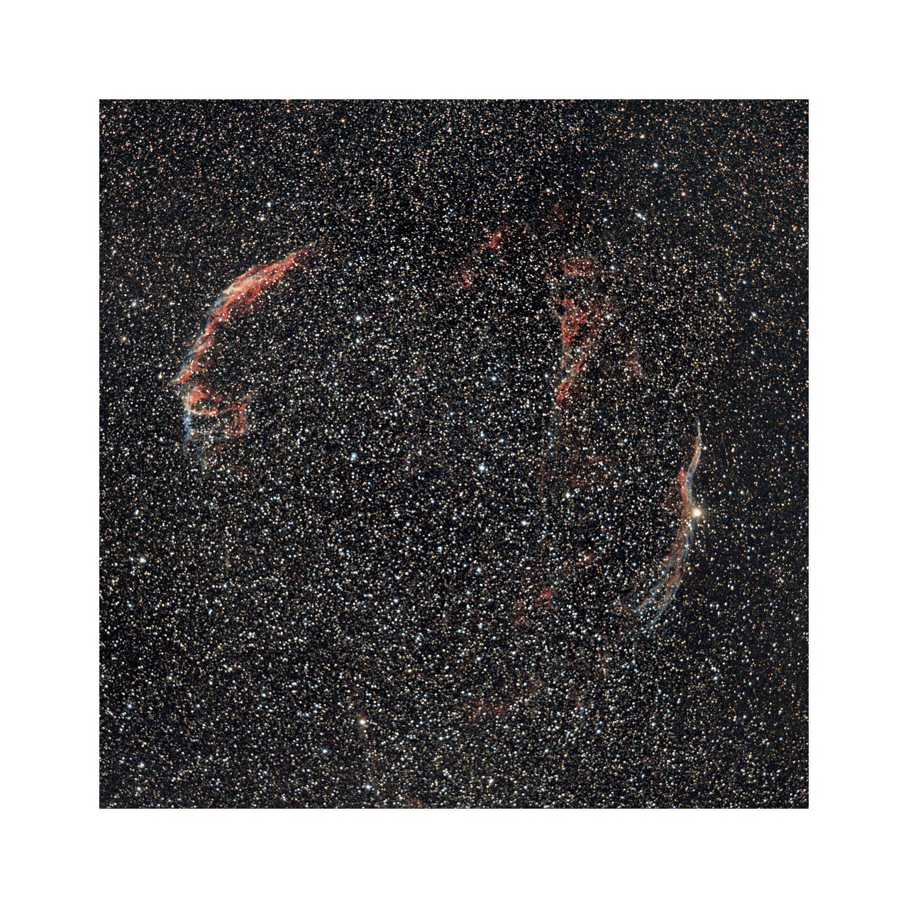 Der Aufbau von Montierung und Optik funktioniert reibungslos. Nach nur 20 Minuten bin ich bereit mich an den Cirrusnebel heranzutasten. Dort, wo früher das Sucherfernrohr mit Autoguider-Kamera befestigt war, klemmt jetzt ein 8x50 Sucher mit Amici-Prisma. Das Sucherbild ist also aufrecht und seitenrichtig. Mit Karkoschkas Atlas oder dem Kosmos Sternatlas ist man dann nach nur zwei Starhops bereits bei 52 Cygni angelangt. Zwei Testaufnahmen und der Bildausschnitt passt perfekt. Jetzt noch eine Testaufnahme mit 60s Belichtungszeit. Die Sterne sind schön rund!