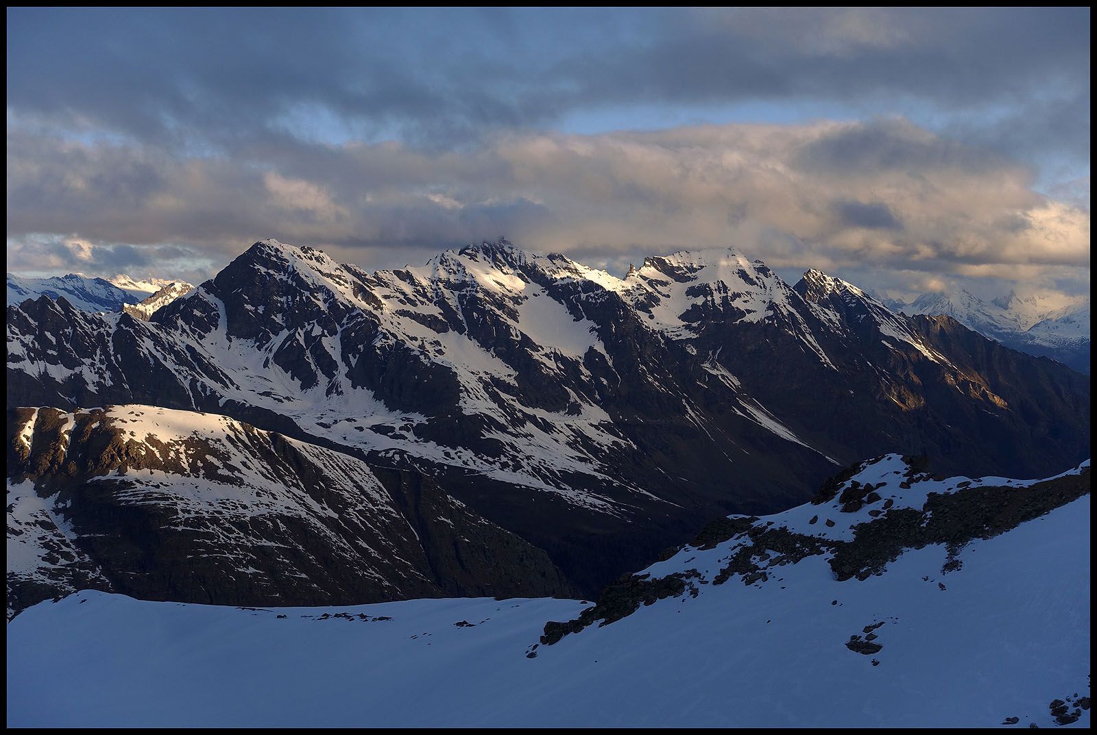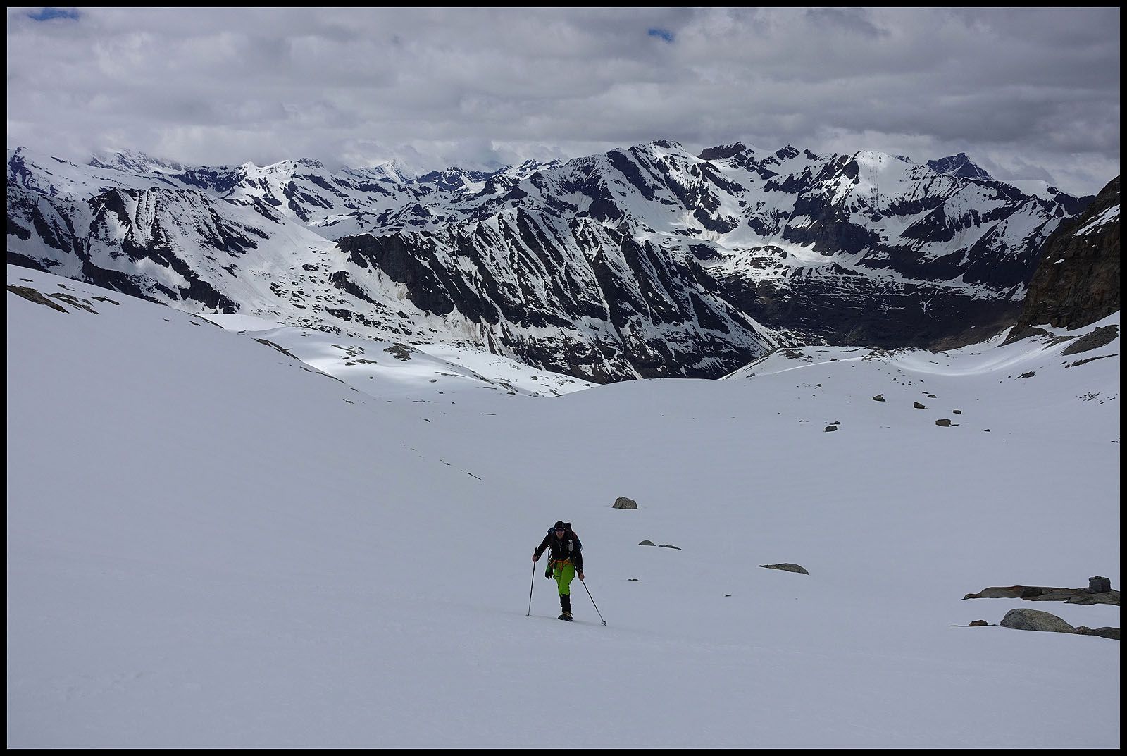 Nein wird es nicht. Nach ca. 2h zieht es immer mehr zu. Die eigentlich vorgesehene Nordwestwand wird bereits zu den Akten gelegt. Vielleicht schaffen wir es ja noch zum Normalweg, der auch von der Chabot-Hütte hinaufführt, hinüber. Aber knapp oberhalb der 3.400m Höhenlinie ist dann Schluss. Wir kehren enttäuscht, aber mit unserem Entschluss glücklich, wieder zur Hütte und unserem erstaunlich komfortablen Winterraum um. Wir treffen dort um viertel nach neun ein.