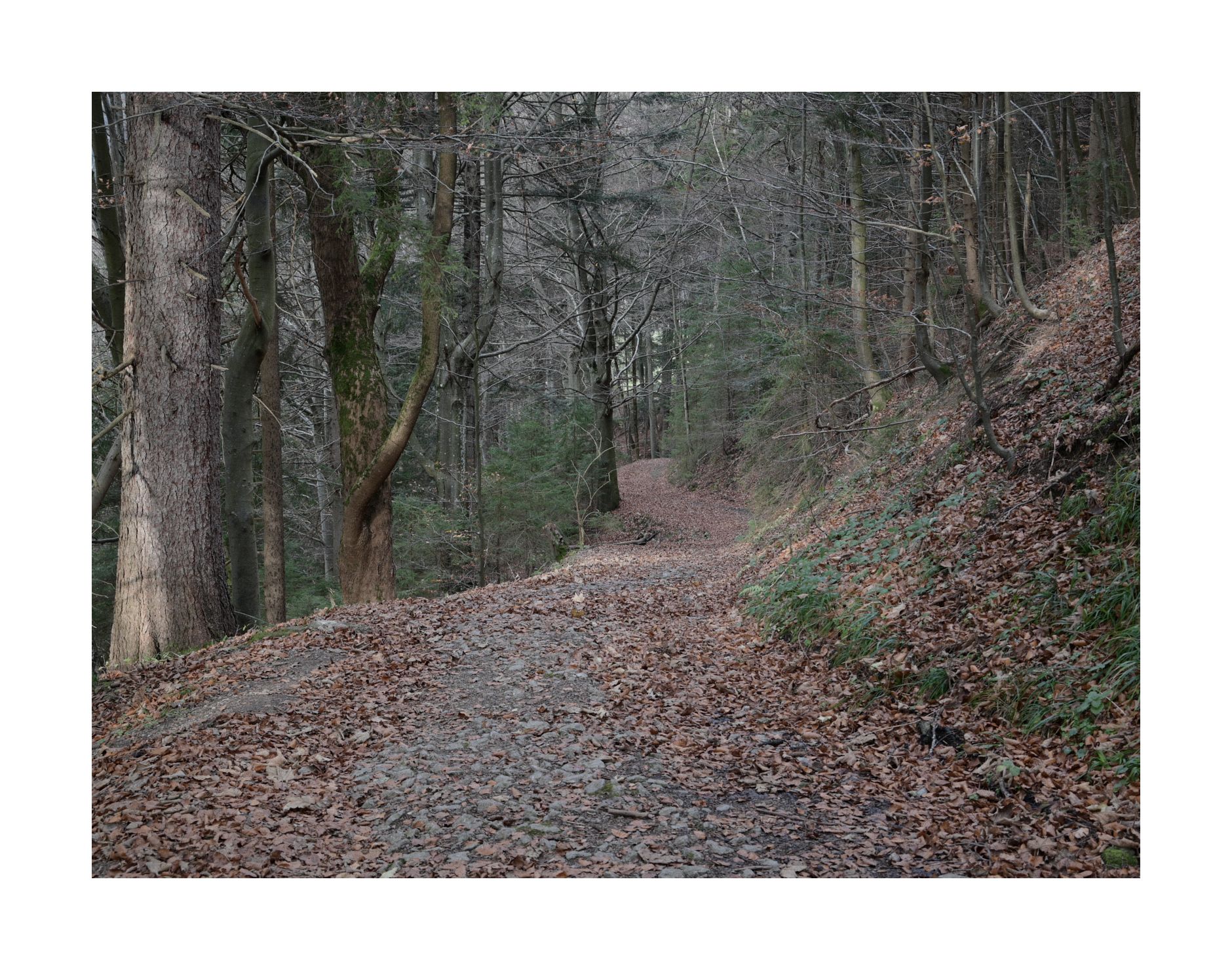 Der Hang ist hier ca. 45° steil. Wenn es dumm läuft, dann treffe ich erst wieder am Bergfuß auf die Zivilisation. Könnte dieses aufgewühlte Laub dort etwa der Weg sein? Bestimmt nur ein Wildwechsel. Die Bäume werden immer dichter. Der Punkt, an dem eine Umkehr noch leicht gewesen wäre, ist schon längst überschritten.