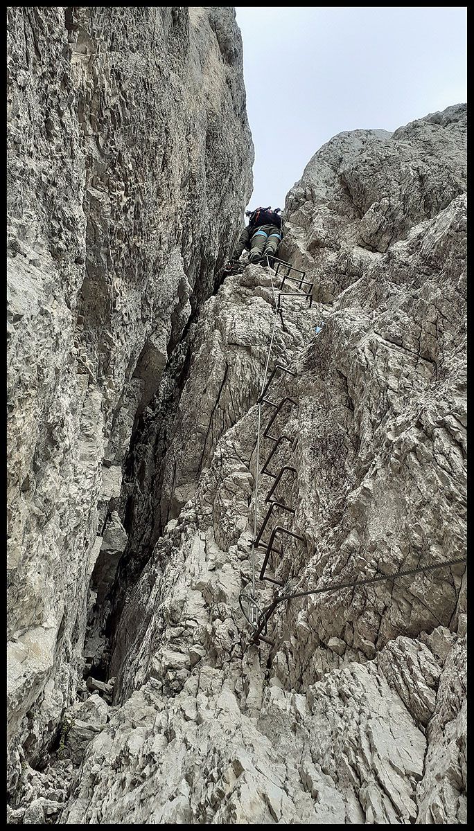 Es geht los. Der Langsamste, also ich, geht vor. Über viele Bügel und eine Leiter geht es zunächst nach oben. Immer wieder quert man auf geräumigen Bändern weiter nach links. Bald steht man vor der schwierigsten Stelle des Klettersteig. Durch einen Kamin schrauben sich Bügel nach oben (C). Die Karabiner verheddern sich in den zu langen Schrauben der Muffen. Das nervt. Ein Blick auf den Höhenmesser verrät die gnadenlose Wahrheit. Nicht einmal die Hälfte haben wir bisher geschafft. Noch 500 Hm sind es bis zum Gipfel.