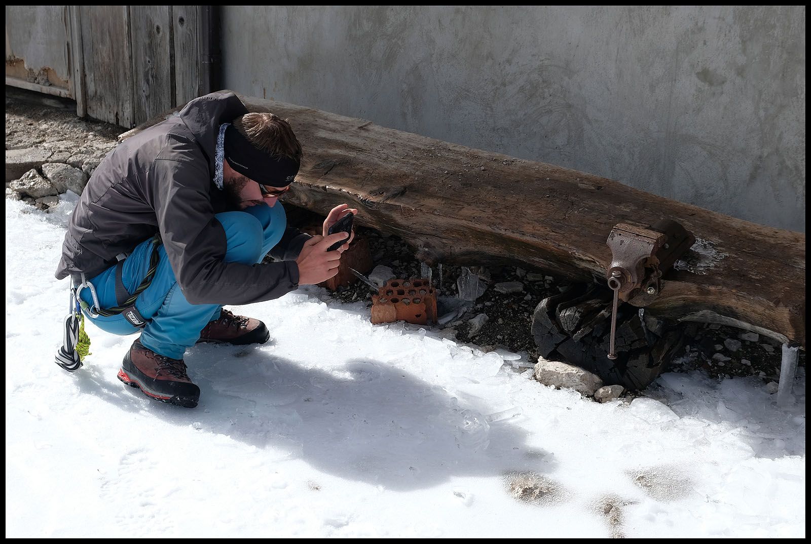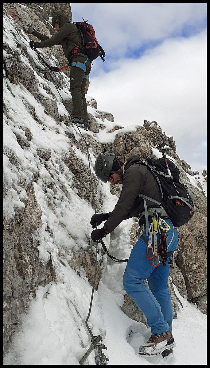 Der Klettersteig will kein Ende nehmen. Oft ist das Drahtseil unterbrochen und man glaubt es endlich geschafft zu haben. Ab ca. 2.800 m behindern zudem Schnee und darunter Eis das Fortkommen. Steigeisen hat keiner dabei. Im AV-Wetterbericht stand ja eine dicke, gelbe Sonne, also warm...