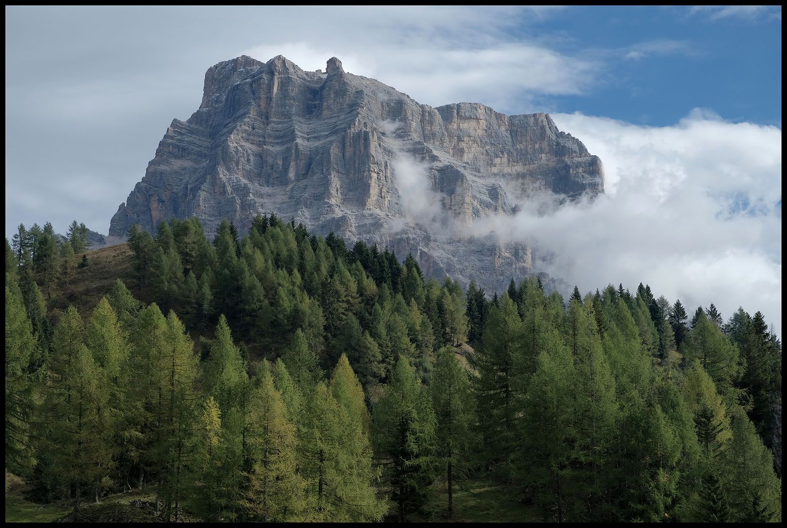 Wir fahren vom Staulanzapass hinab nach Pecol, um von dort zu unserem neuen Stützpunkt, der Rif. Coldai, aufzusteigen. Wir parken auf dem großen Parkplatz bei der Talstation einer Gondelbahn. Wir wollen gerade durchstarten, als wir uns von einem Zona-Abschlepp-irgendwas-Schild ins Boxhorn jagen lassen. Das Auto wird nochmals in die Ortsmitte verlegt. Jetzt geht es endlich richtig los und zwar recht steil. Nach ca. 30 Minuten stoßen wir auf einen breiten Fahrweg und folgen diesem zur Pioda-Alm. Wir beobachten die Landschaft und genießen die hübschen Italienerinnen, die sich etwas abseits zu uns setzen.