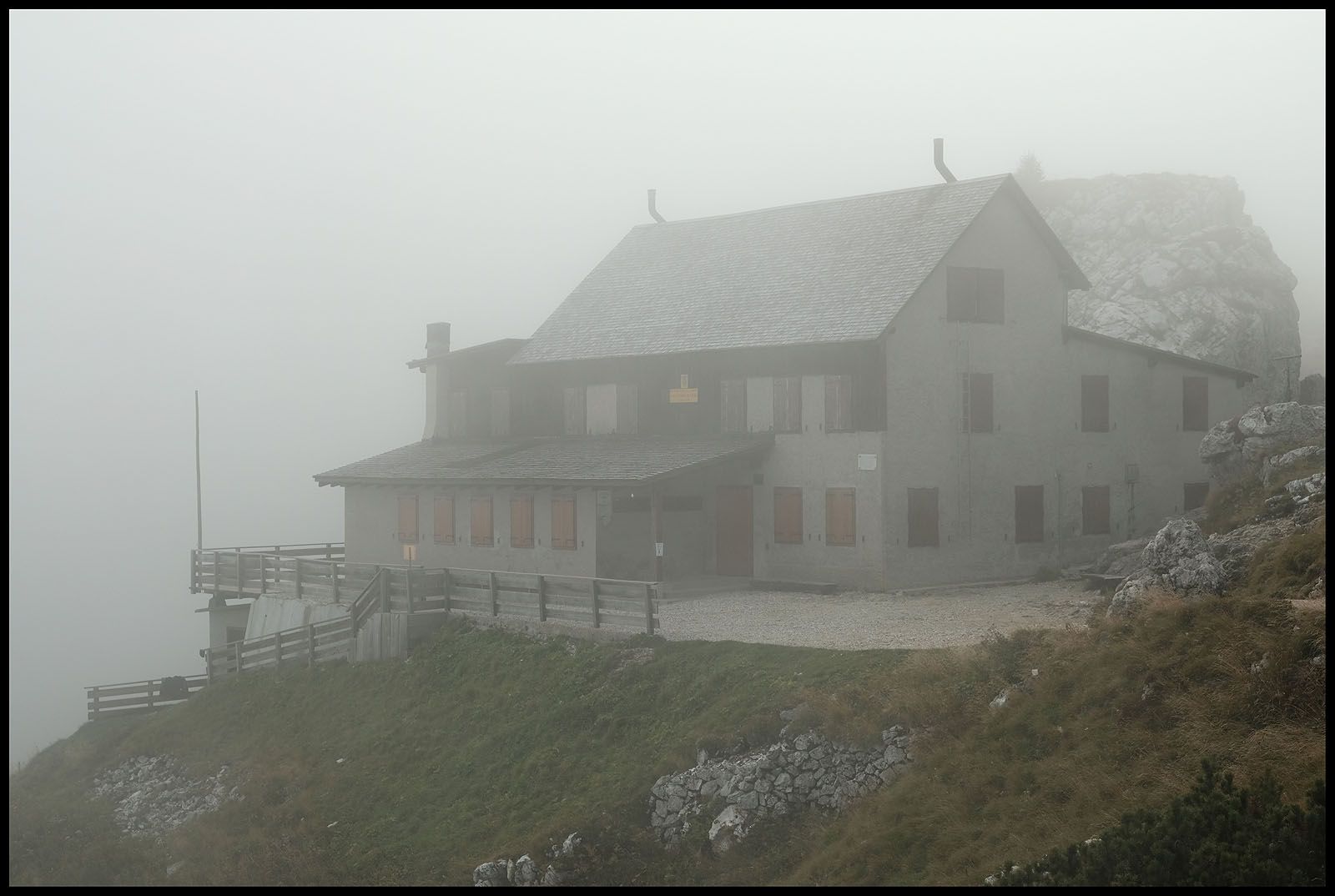 Wir richten uns im Keller ein. Der Nachmittag wird vertrödelt. Bei einem ersten Erkundungsgang ums Haus finden wir zunächst kein Wasser. Frank kann nicht an sich halten und steigt mit leeren Flaschen voller Elan wieder zum zuvor erwähnten Bach ab. Berni geht ums Haus und ich nutze Wolkenlücken zum Fotografieren. Plötzlich schallt es "Hier gibt's doch Wasser" durch die Stille des Nebels. Frank ist vor 45 Minuten losgedappt und wir hoffen, dass uns in den kommenden 45 Minuten einfällt, wie wir ihm das dann schonend beibringen. Aber da steht er bereits mit seinem schwerem Rucksack und stolz auf seinen nur einstündigen Ausflug. Also sagen wir es ihm kurz, und schmerzlos, und ohne Umschweife, und direkt...