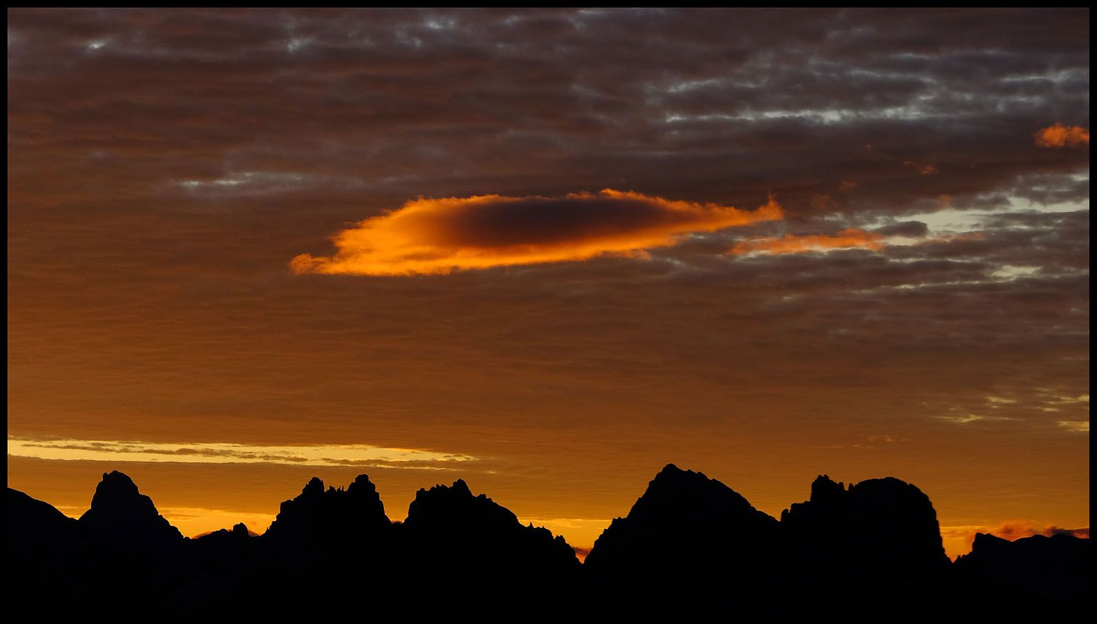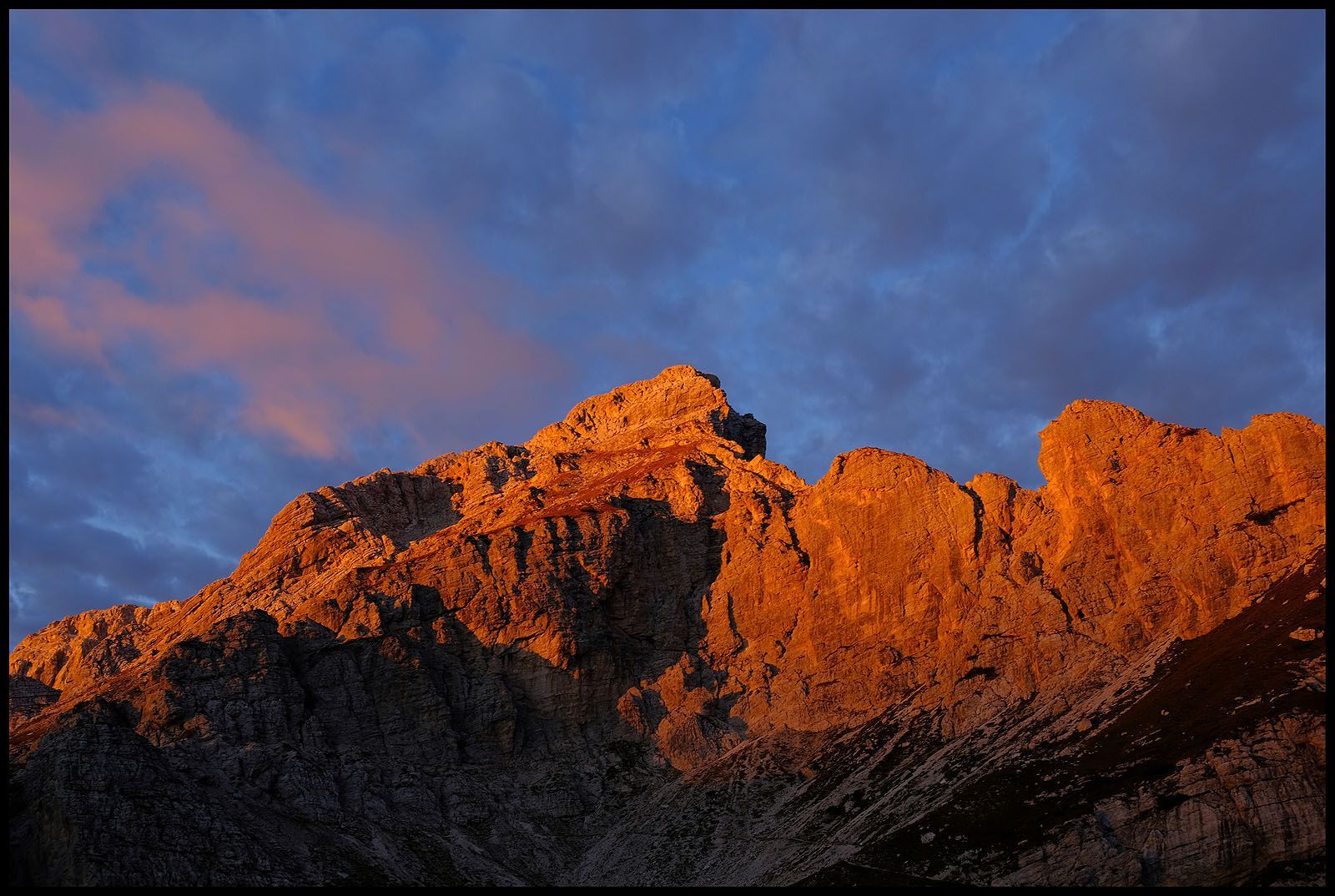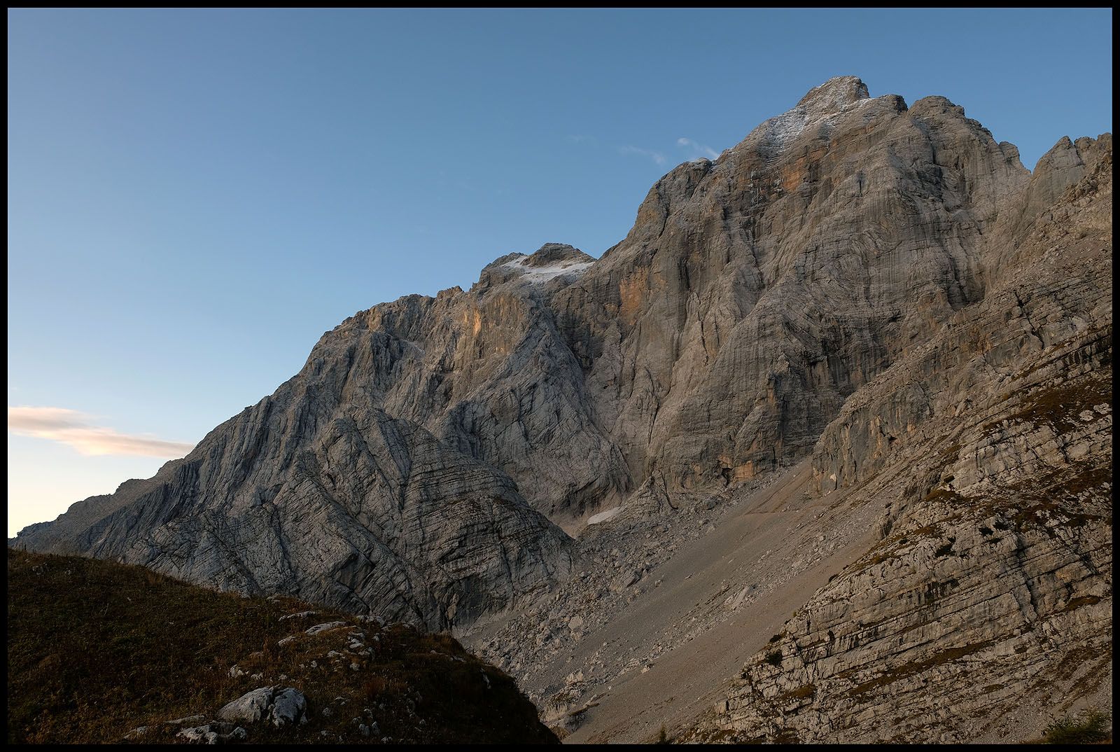 Meine kranke, ursprüngliche Idee war es übrigens, das gesamte Biwakgepäck über den Alleghesi hierher zur Rif. Torrani zu schleppen, um dann hier die Nacht zu verbringen. Ich bin froh, dass wir heute noch zur Rif. Coldai zurück dürfen. Das ist übrigens kein Spaziergang. Auch der Normalweg zur Civetta verfügt über mehrere Klettersteigabschnitte (bis B). Ich mag bald keine Drahtseile mehr sehen...