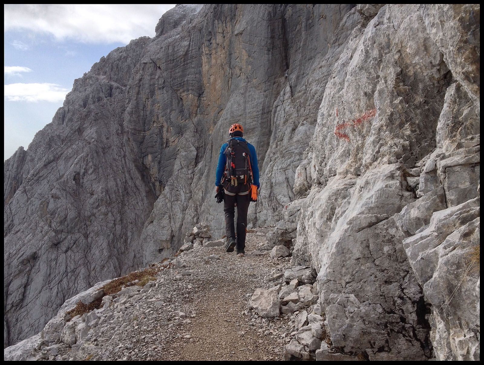 Klettersteigset, Gurt und Helm gehören in den Rucksack und sollten dann auch benutzt werden. Bei Schnee und Eis sind Grödel oder Leichtsteigeisen hilfreich.