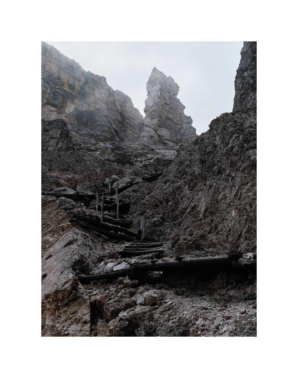Als ich jedoch in die Furc dla Piza hinaustrete, ändert sich alles schlagartig. Der Nebel lichtet sich und die Sonne kommt mit Wucht hervor. Der Col dala Pieres wirkt zum greifen nahe. Er ist einem schön angelegten Steig von hier aus in ca. einer Stunde erreichbar. Und was ist das Weiße dort? Das ist Schnee. Der Regenschauer der letzten Nacht ist hier etwas kühler ausgefallen.