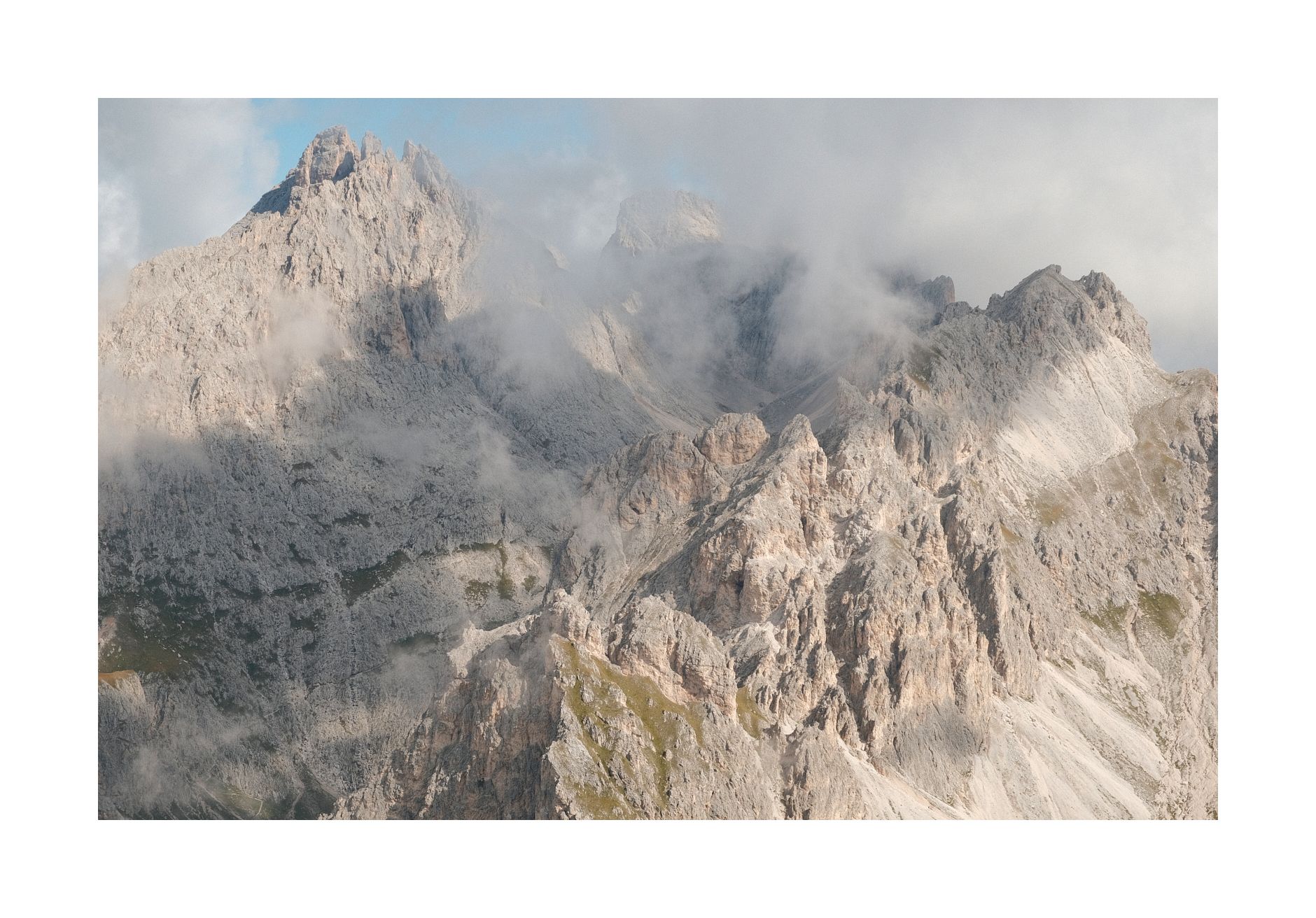 Der Langkofel durchbricht die Wolken. Saas Rigais und Furchetta zeigen sich abwechselnd zwischen den weißen Wattewolken.