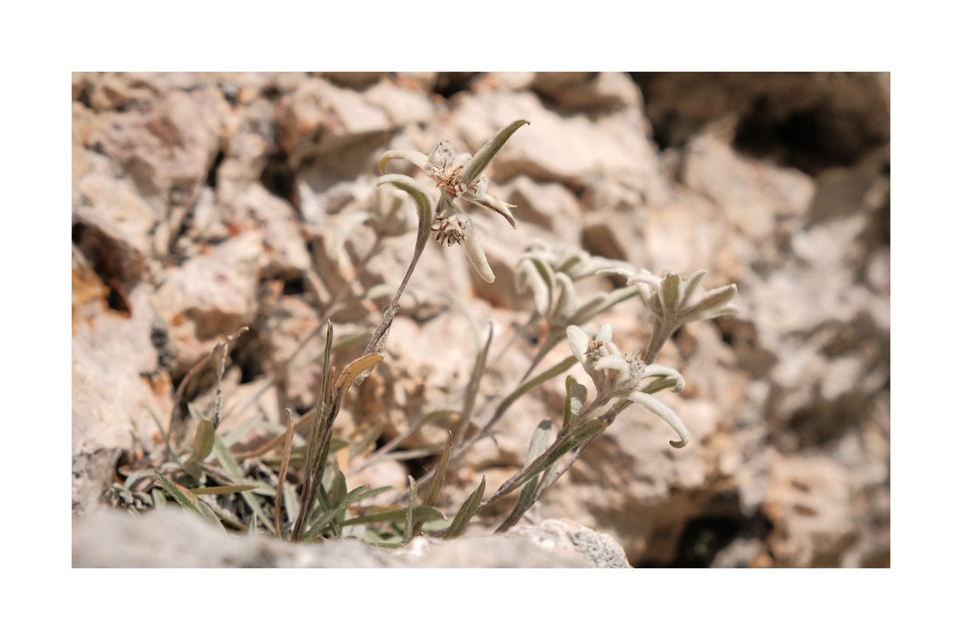 Ich entdecke Edelweiß. Zuerst ist es nur eine Blüte, dann ein Grüppchen und zuletzt eine ganze Edelweißwiese. Man muss schon sehr achtgeben, um hier keinen Frevel an der seltenen Natur zu begehen.