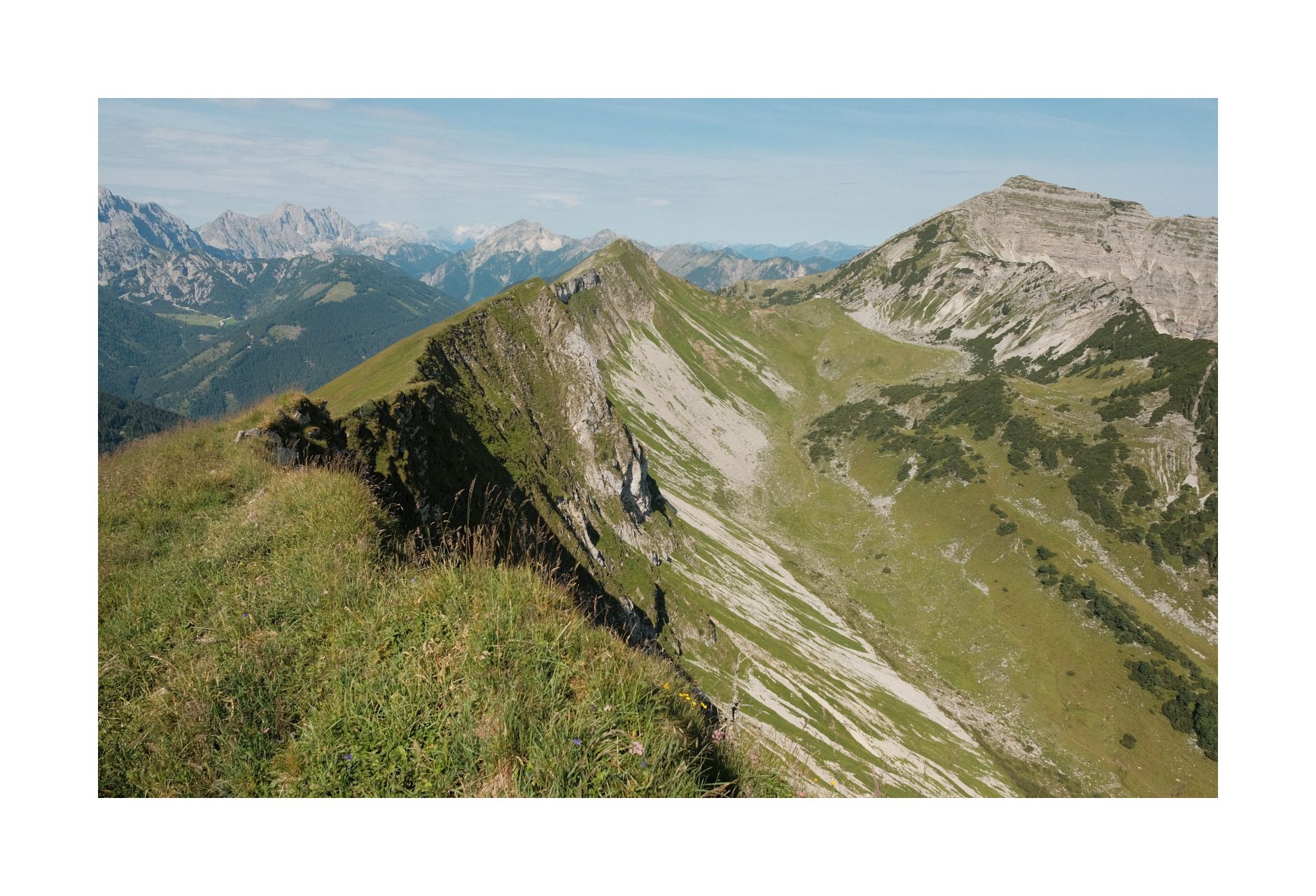 Jetzt geht es richtig los. Die kühne Gratlinie zum Baumgartenjoch liegt vor mir und ich breche in terra incognita auf. Der Grat ist schmal. Nach Norden bricht er steil ab, nach Süden hin erreicht der Grashang mitunter 45°. Das Gras steht jetzt, im Berghochsommer natürlich hoch und manchmal erkennt man eine verborgene Mulde darunter nicht. Man gerät unvermittelt ins Wanken. Im Zweifelsfall hätte ich mich natürlich für den südlichen Grashang entschieden.