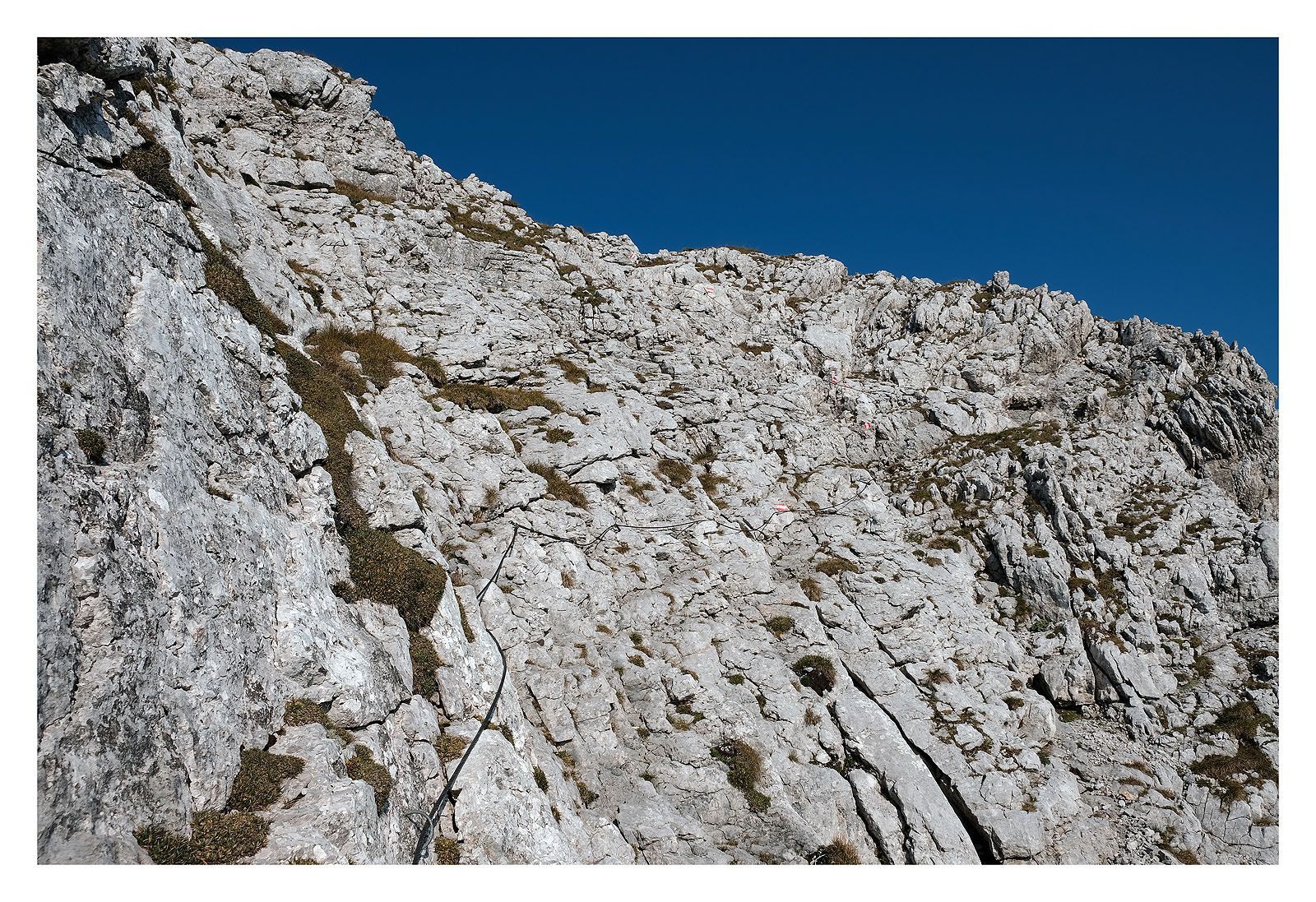 Es liegt viel loses Geröll herum. Ganz wichtig deshalb: Helm! Hier ist allerlei Gams und Mensch unterwegs. Zwei Mal flogen mir heute die Brocken um die Ohren, und das an einem Gipfeltag mit eher durchschnittlicher Frequenz.
