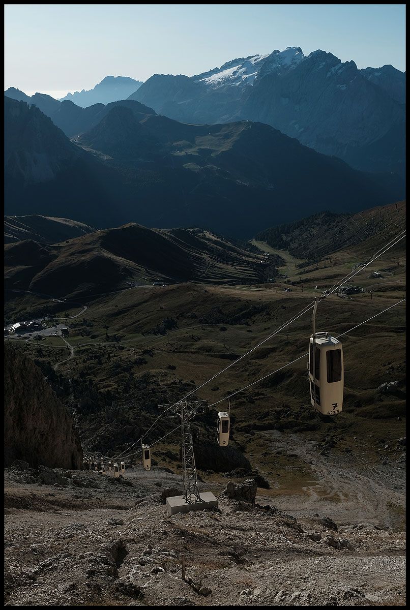 Ja, doch. Man kann sich beim Aussteigen aus der Gondel zu lange festhalten. Die Gondelbahn in die Langkofelscharte bremst auf jeden Fall nicht und schleift mich samt Hose und Knie über die rutschfeste Gummimatte. Jetzt hat die Hose eine Schürfwunde und das Knie ein Loch. Ich bin stinksauer. Ich flicke die Hose mit drei Sicherheitsnadeln aus dem Verbandskasten, dann verlassen wir endlich die Demenz Hütte.