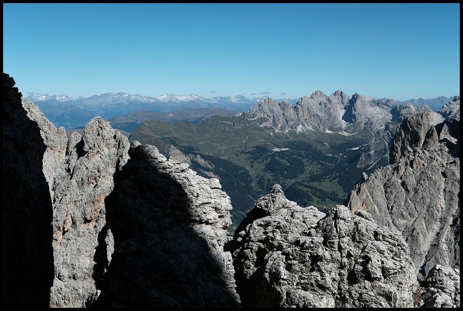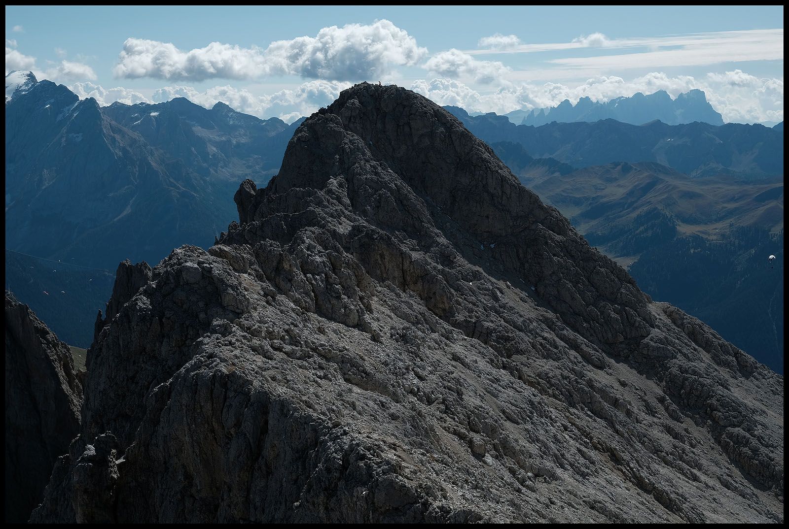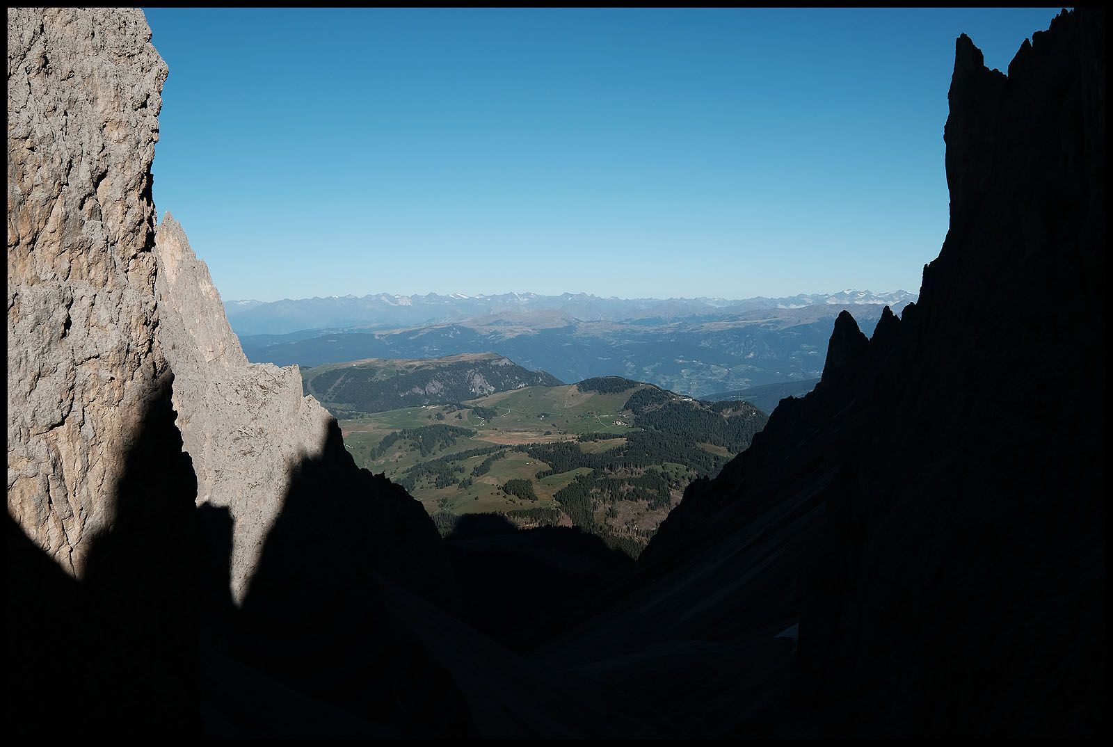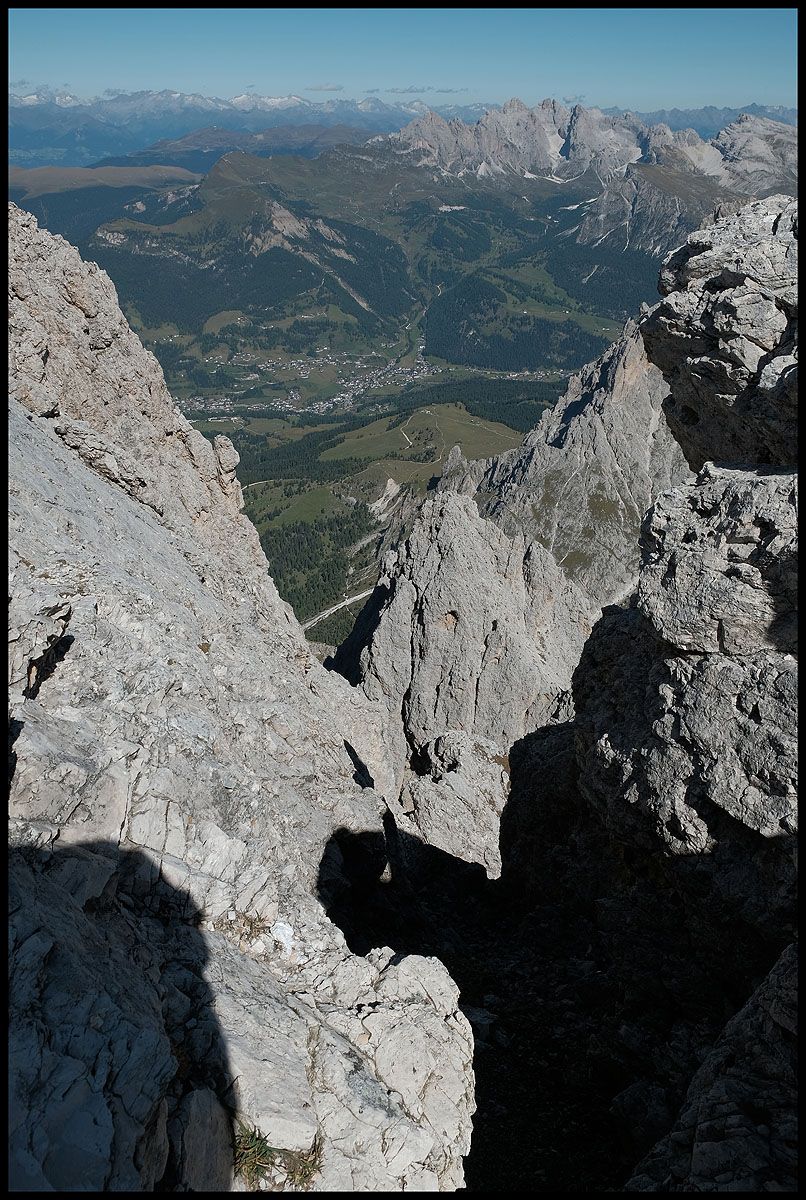 Direkt nach der Unterbrechungsstelle des KS folgt die Leiter über einen Felsspalt. Da man jedoch ständig mit dem Umhängen der Karabiner beschäfftigt ist, bemerkt man nicht viel vom Leiterspektakel. Es folgen noch einige Stellen zum Zupacken und dann ist in einer Rechtskurve auch schon wieder Schlüss mit Klettersteig. In leichter Kletterei (i-II) und dünner werdender Luft geht es dem Mittelgipfel des Plattkofels entgegen.