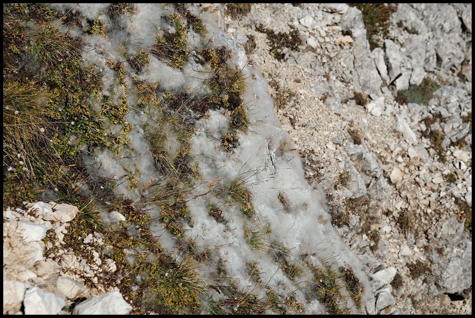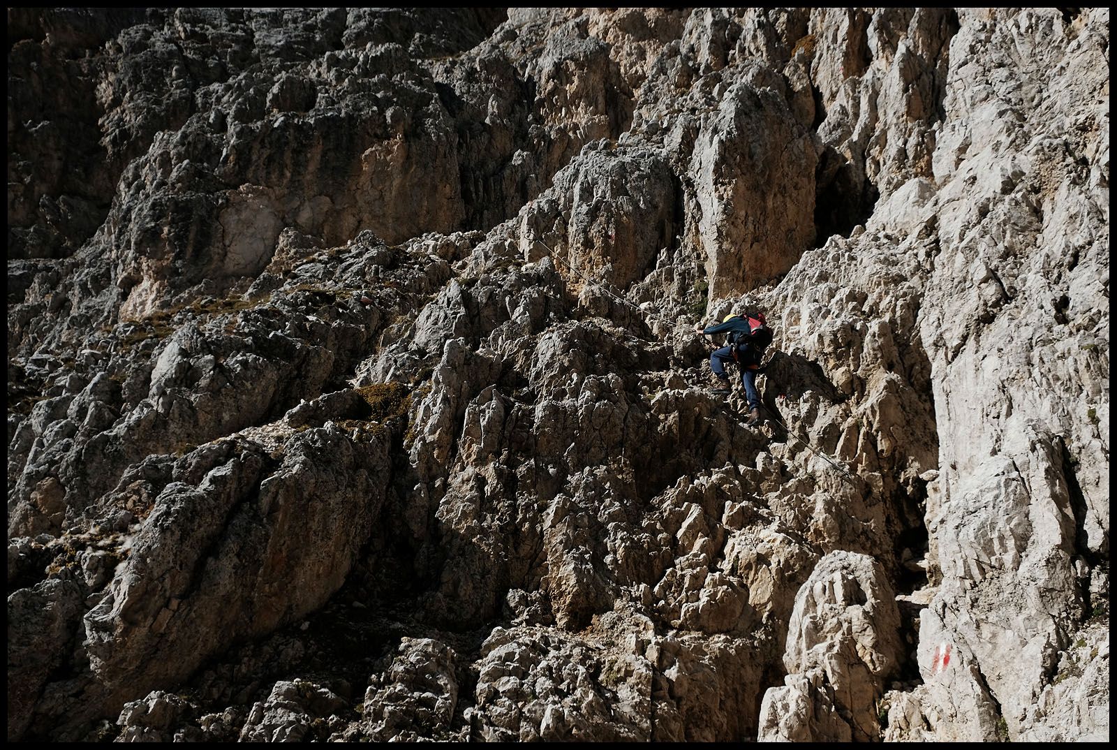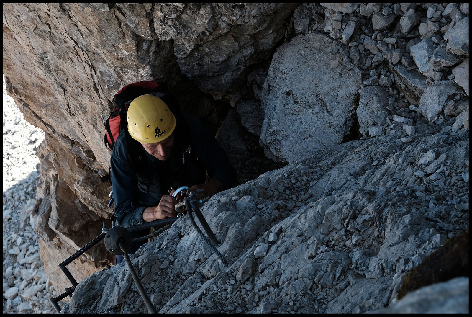 Über Schutt ging es hinab und über Schutt geht es hinauf. Wir stehen am Einstieg, den wir wie alle anderen für den Einstieg halten, weil da ein Drahtseil um die Ecke führt. Doch hinter der Ecke ist auch schon wieder Schluss mit Klettersteig. Man bewegt sich lange ohne Seil durch Rinnen kletternd aufwärts (I).