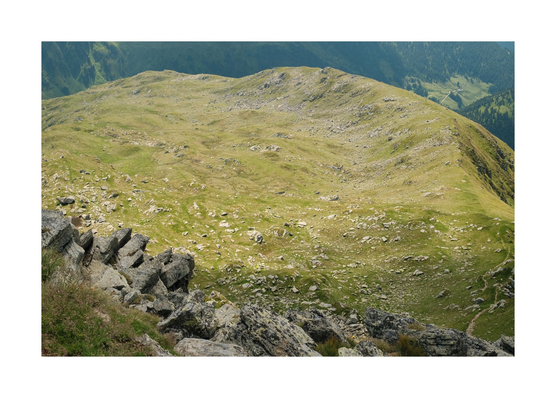 Weiter geht es über den ausgedehnte Platten und Grasflächen am Ostgrat hinab. Das ist zunächst einfach (T3), aber 'das dicke Ende kommt bestimmt noch'. Ich muss irgendwie nach Norden, um auf eine Pfadspur zur Salzachquelle zu gelangen. Allerdings befinden sich links von mir scheinbar nur steile Abbrüche. Ganz hinten erkenne ich jedoch eine Grasrampe, die mich hinabführen könnte.
