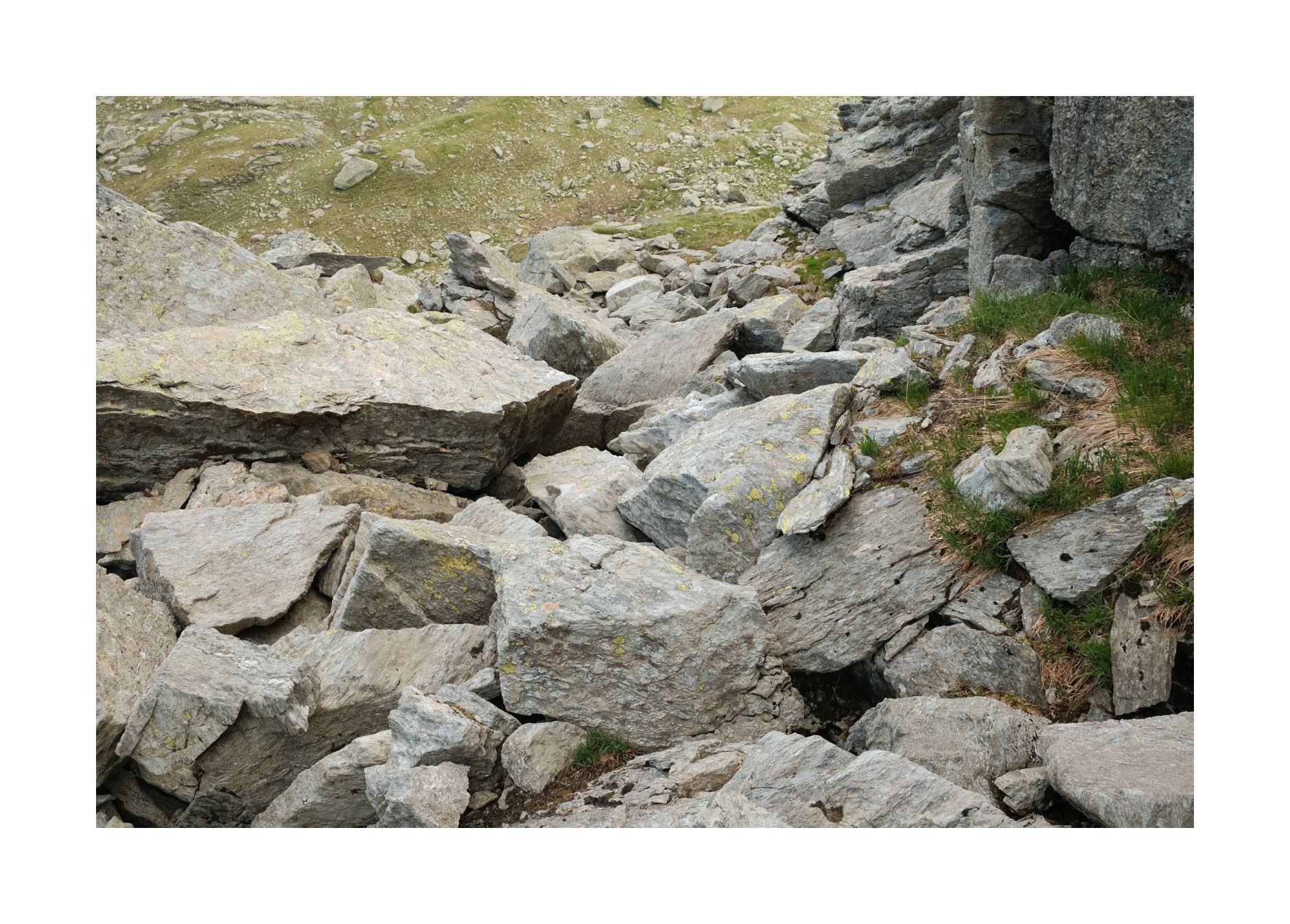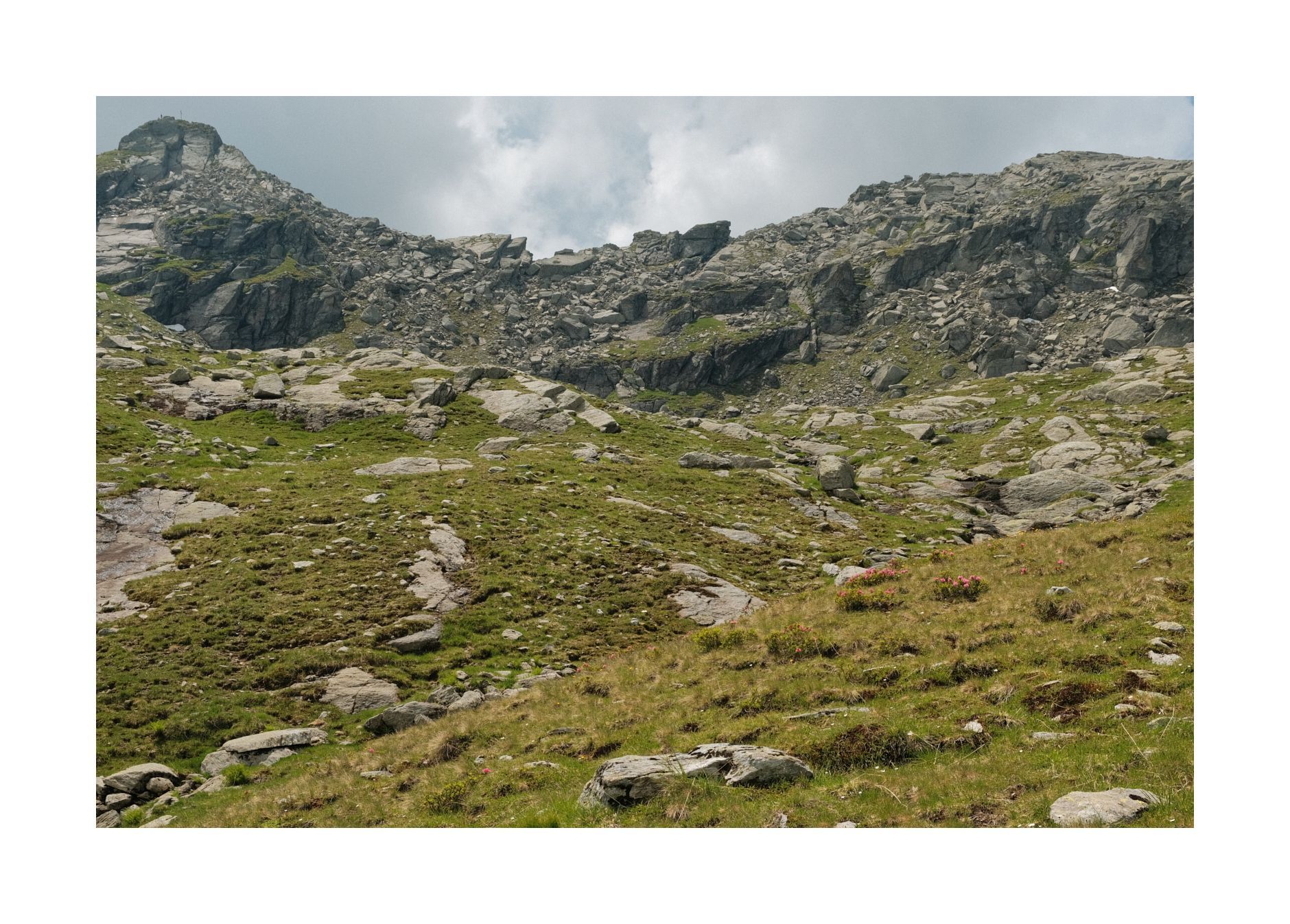 Schnell mache ich moich vom Acker, um den Bruterfolg nicht länger zu gefährden, und erreiche eine kleine Scharte östlich, unterhalb des Gipfels. Über die Wand ginge es im III. Grad wieder nach oben. Unter einem Stein vor mir ragt etwas hervor, braun, geschlängelt. Ich traue mich nicht, mich zu bewegen. Mit dem Fotoapparat zoome ich das heran und entdecke das kalte Ende einer Kreuzotter! Bei meinem nächsten Schritt verschwindet sie vollständig in ihrer Höhle.