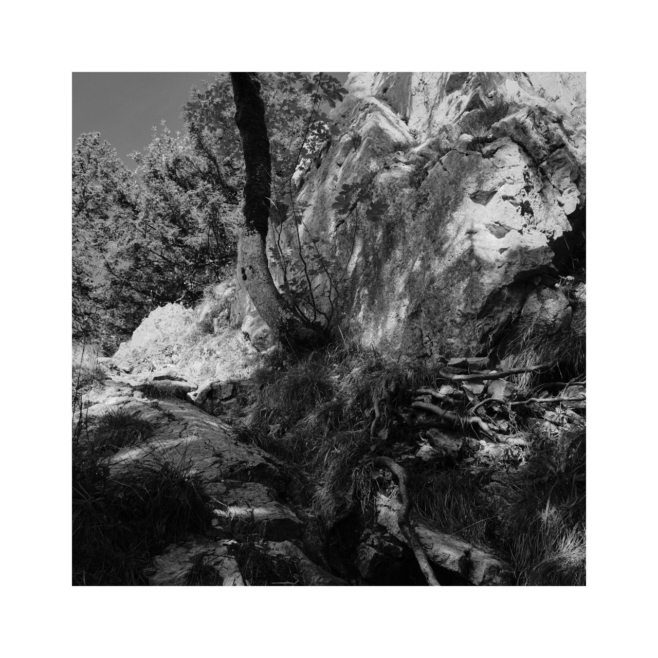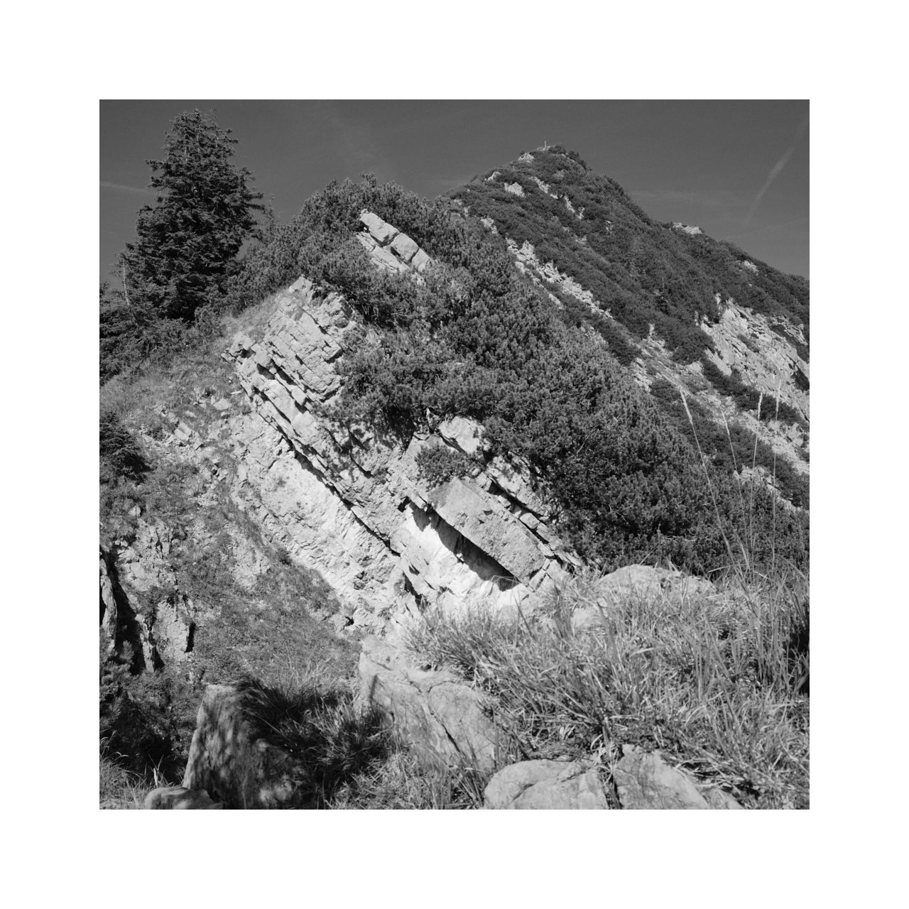 Nach ca. 100 m wird aus der Pfadspur ein schöner, alter Jägersteig und der beißende Geruch lässt auch nach. Ohne großes Aufhebens mäandert der Steig über zwei Geländestufen hinweg auf den Ansatz des Ostgrates zu. Als sich nach einer viertel Stunde die Bäume lichten, erkennt man links oben am Grat einige Felsriffe. In einem kurzen Zickzack geht es nun direkt auf diese Felsmauern zu. Ganz plötzlich mündet die schotterige Spur in einer kleinen Drei-Meter-Wand. Das ist auch schon die Schlüsselstelle der Tour. Kein Problem, über gut gestuften Fels geht es schnell und einfach (I) darüber hinweg.