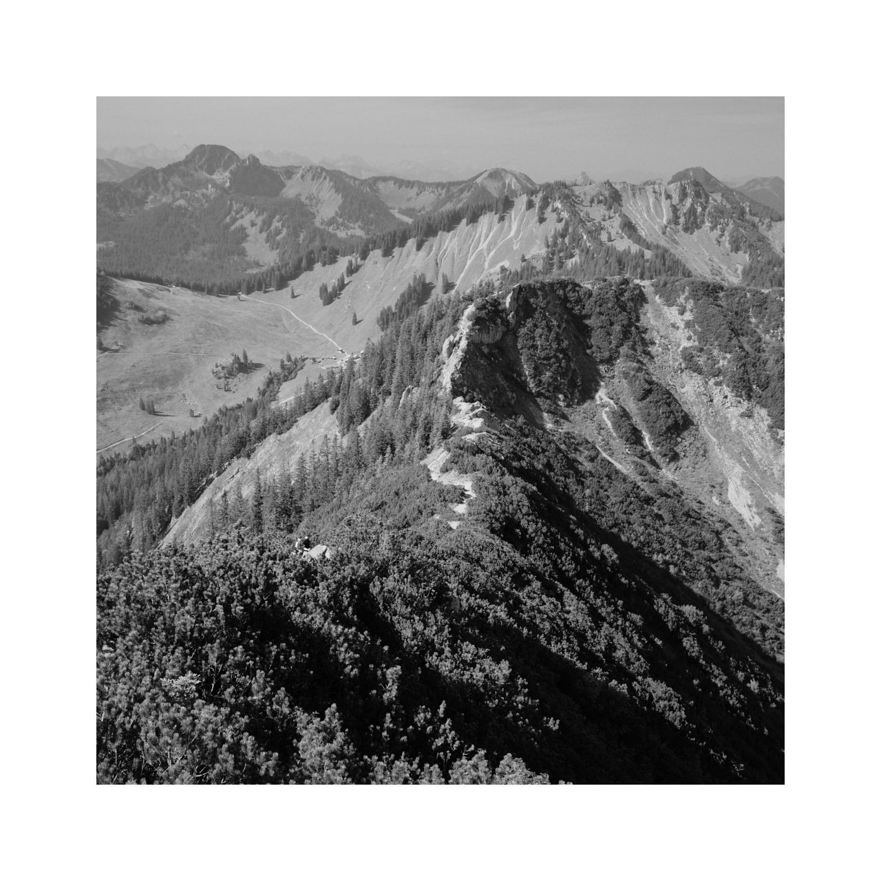 Im weiteren Verlauf bietet der nun schmale Ostgrat noch einige, unschwierige Kraxelstellen und beeindruckende Tiefblicke nach Norden. Und dann weichen die knorrigen Bäume abrupt den Latschen. Eine relativ breite Gasse führt mich direkt auf den Gipfel der Brecherspitze zu. Wenige Meter unterhalb des Gipfels warnt ein Schild "KEIN ABSTIEG, LEBENSGEFAHR". Wenn man bedenkt, welches Klientel hauptsächlich auf die Brecherspitze steigt und dass hier in diesem Jahr sogar schon ein tödlicher Unfall zu beklagen war, dann kann man diese Warnung verstehen. Der Ostgrat der Brecherspitze ist für Ungeübte oder reine Bergwanderer nicht geeignet.