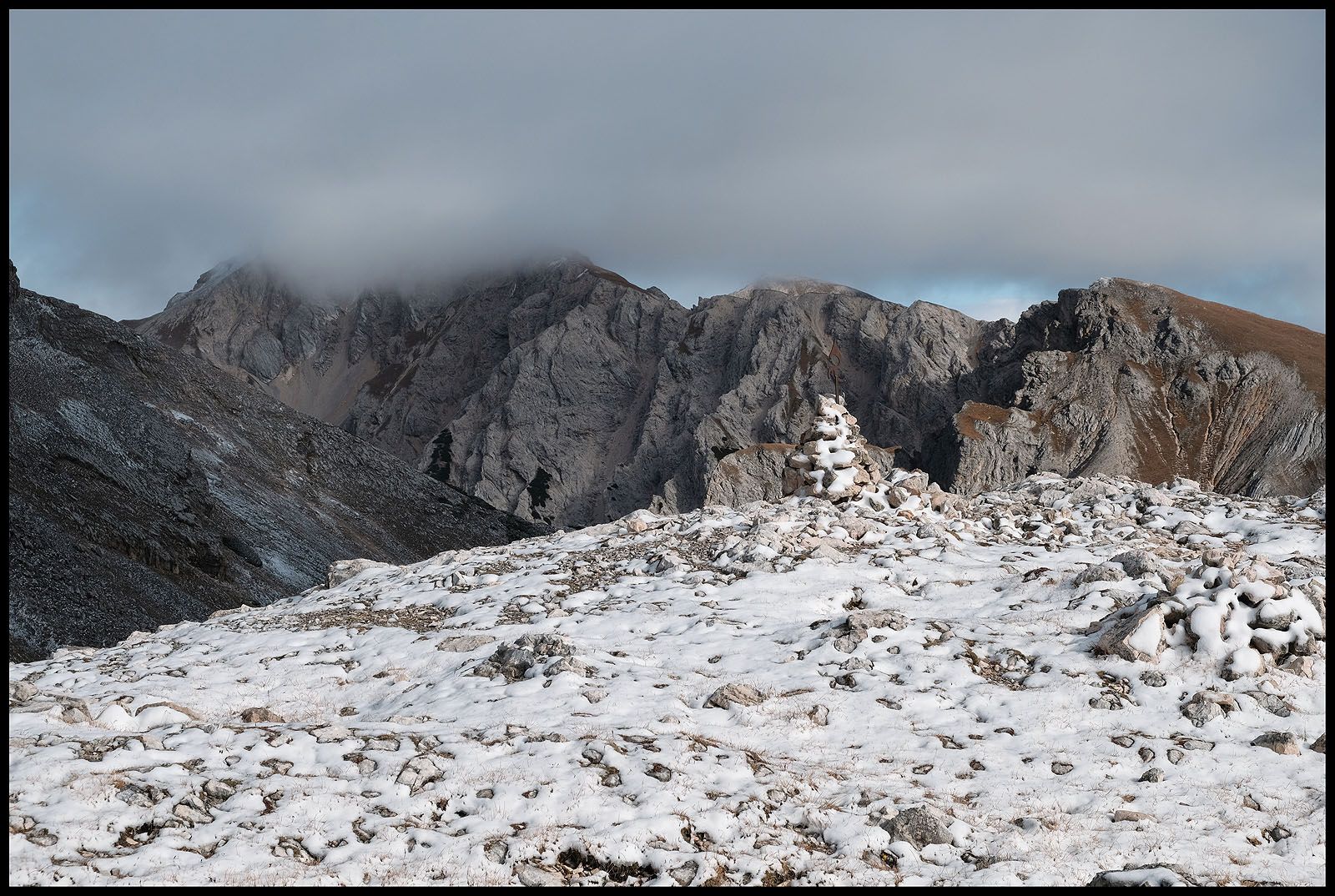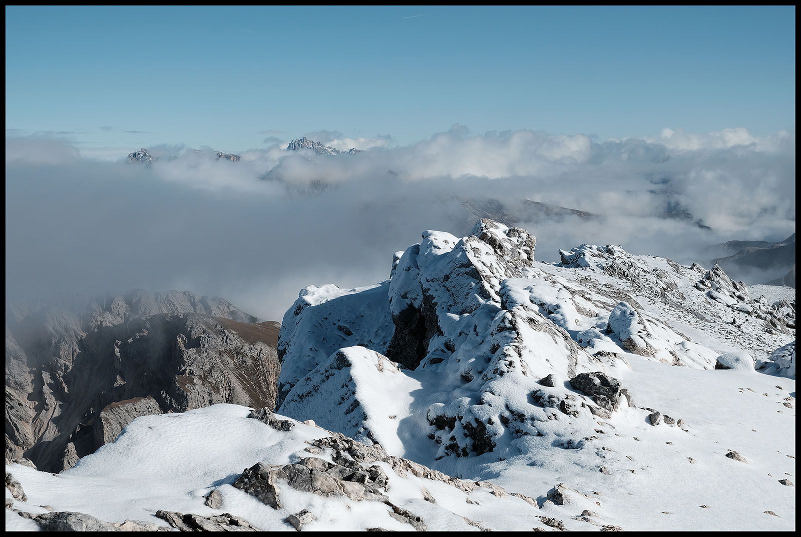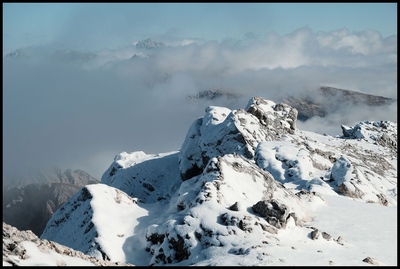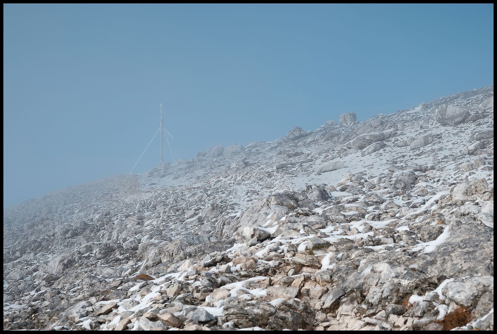 Der innere Schweinehund hat verloren. Es geht nach oben und wieder in den Nebel. Fast hätte ich das Gipfelkreuz übersehen und wäre dagegen gerannt. Beim ersten Foto sehe ich verdutzt auf die Wiedergabe. Wieso ist der Himmel plötzlich blau und nicht etwa grau? Da reißt es auf und man sieht mehr als man heute Morgen hätte vorhersehen können. Sogar die Drei Zinnen lassen sich sehen…