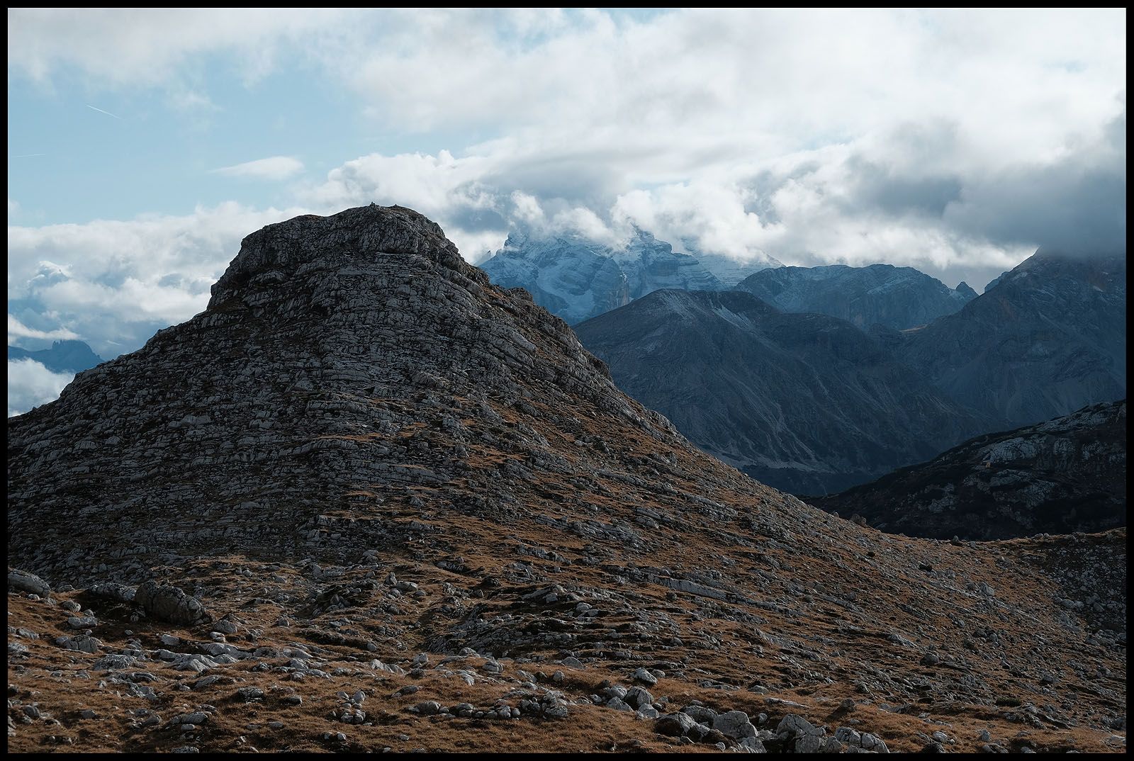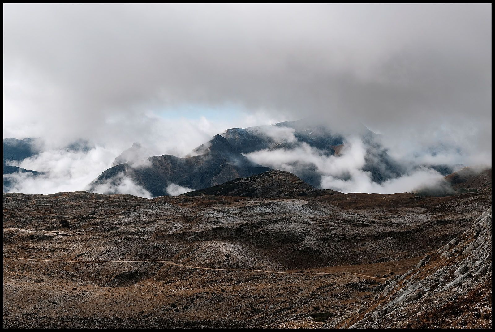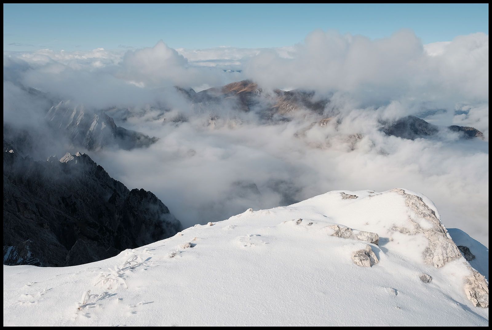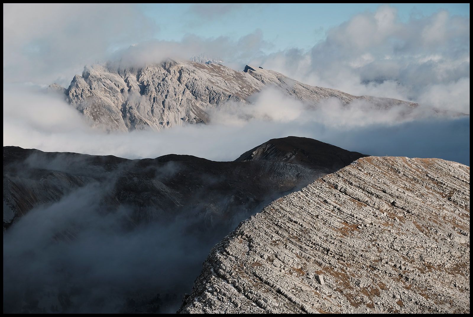 Der innere Schweinehund hat verloren. Es geht nach oben und wieder in den Nebel. Fast hätte ich das Gipfelkreuz übersehen und wäre dagegen gerannt. Beim ersten Foto sehe ich verdutzt auf die Wiedergabe. Wieso ist der Himmel plötzlich blau und nicht etwa grau? Da reißt es auf und man sieht mehr als man heute Morgen hätte vorhersehen können. Sogar die Drei Zinnen lassen sich sehen…