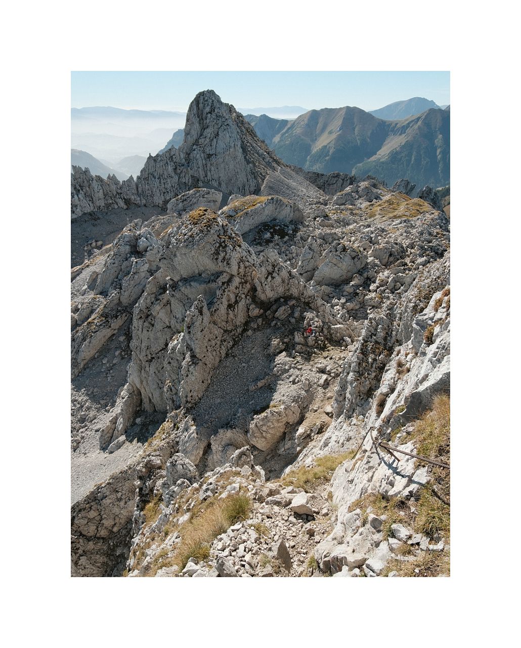 Platz ist auf dem Gipfel der TAC kaum. Wildfremde Menschen reichen einander die Handys, um ein kanppes Gipfelfoto mit abgeschnittenen Füßen zu ergattern. Etwas östlich des Gipfels ist mehr Platz, wenn man ein Brotzeit und die Zeit für eine solche hätte. Ich steige bald schon wieder ab und nehme noch ein Bild für das Weitwinkelteilprojekt von Projekt 12 mit (s.u.).
