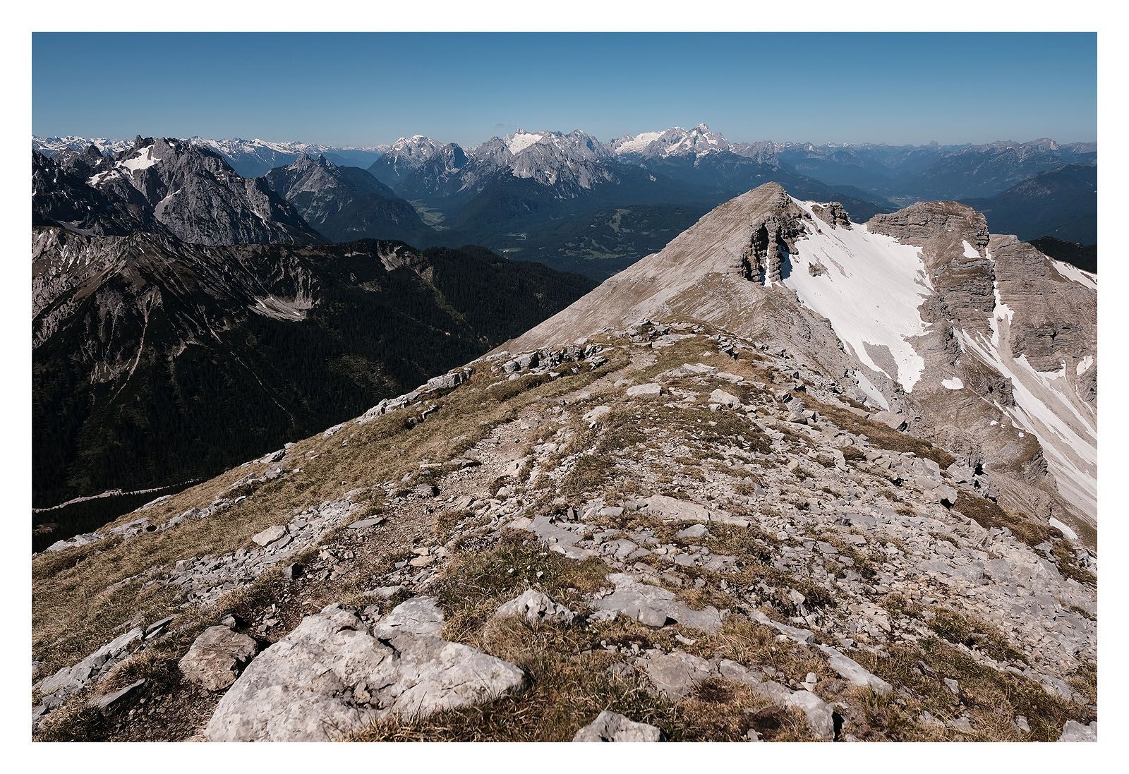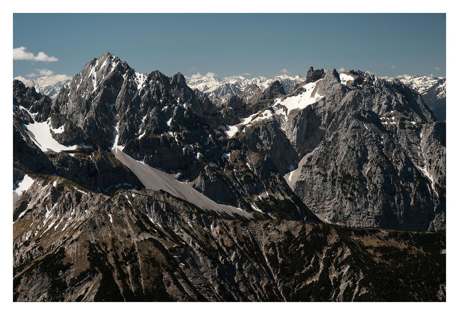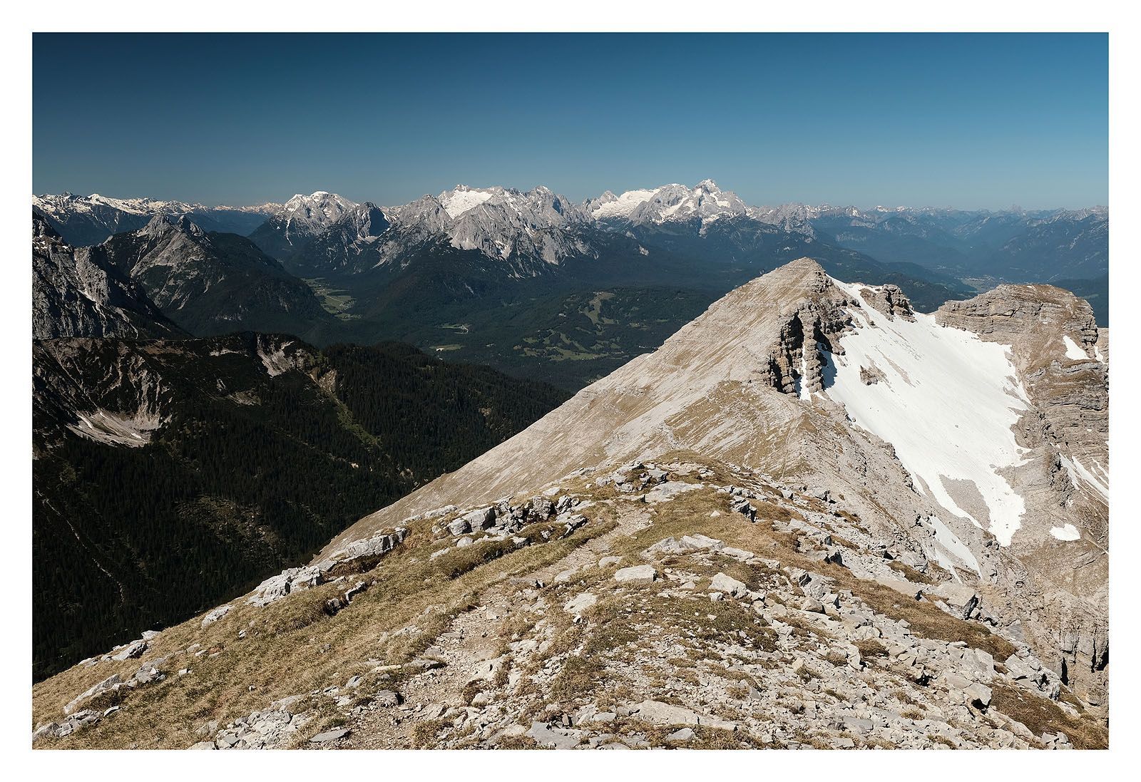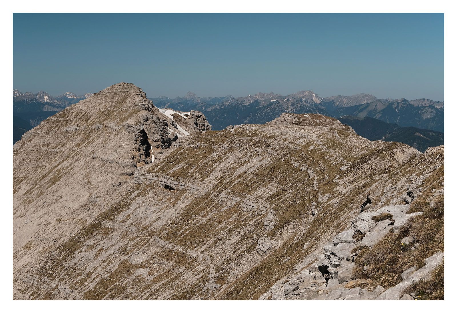 Man nähert sich dem Feldernkreuz. Es wird nicht leiser, eher lauter und die People noch zahlreicher. Ich lasse diese Gipfel aus und warte an der nahe Scharte auf mein Foto ohne wildfremde Menschen. Eine eifrige Hundeführerin gibt ihrem Fiffi beim Übergang zur Schöttelkarspitze kurze und knappe Anweisungen: „Nein – weiter – stopp – weiter – hier – da …“ Irgendwie fühle ich mich angesprochen und bin froh als ich völlig irritiert über ein allerletztes Schneefeld abkürzen kann, um schnell Land zu gewinnen.