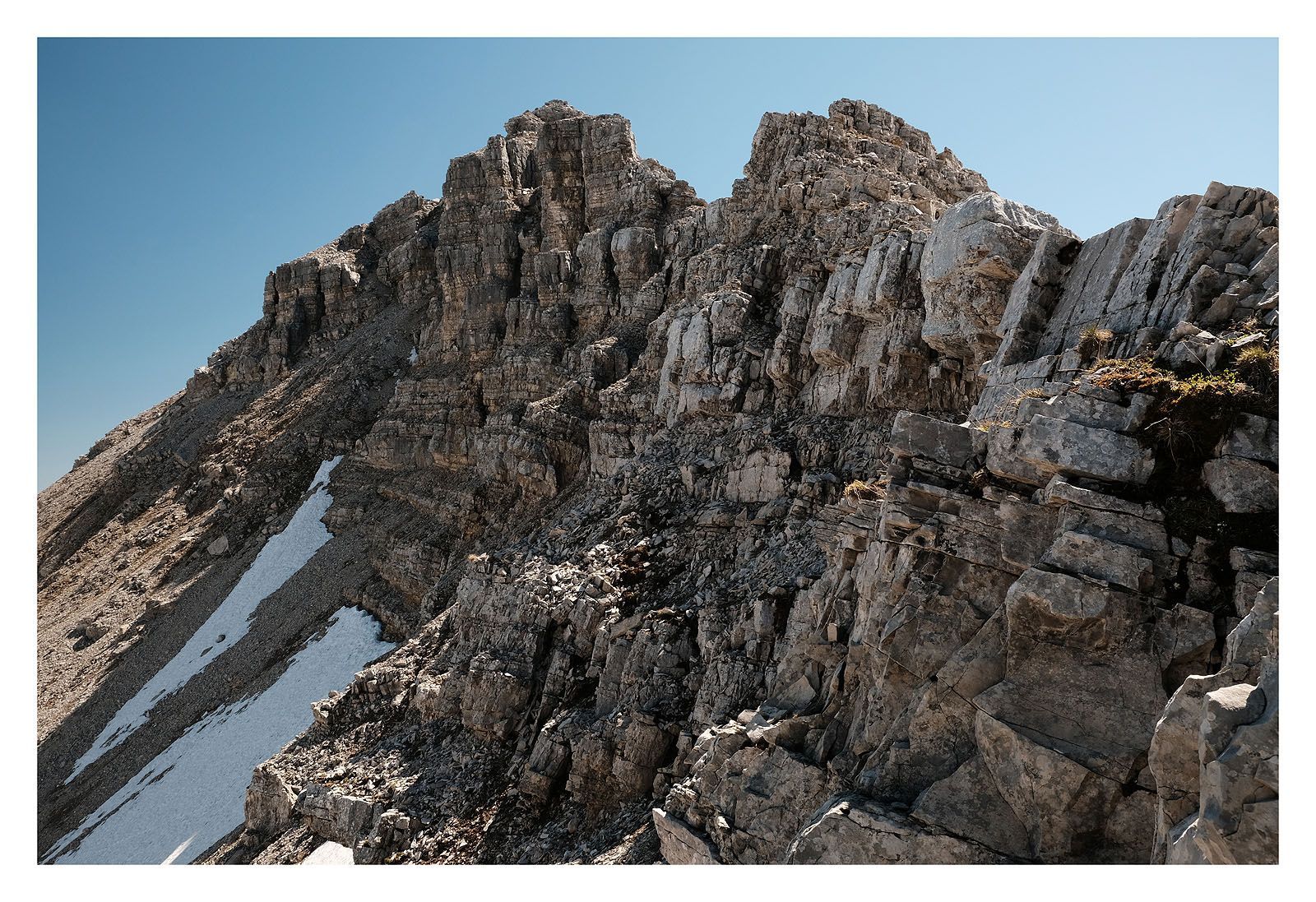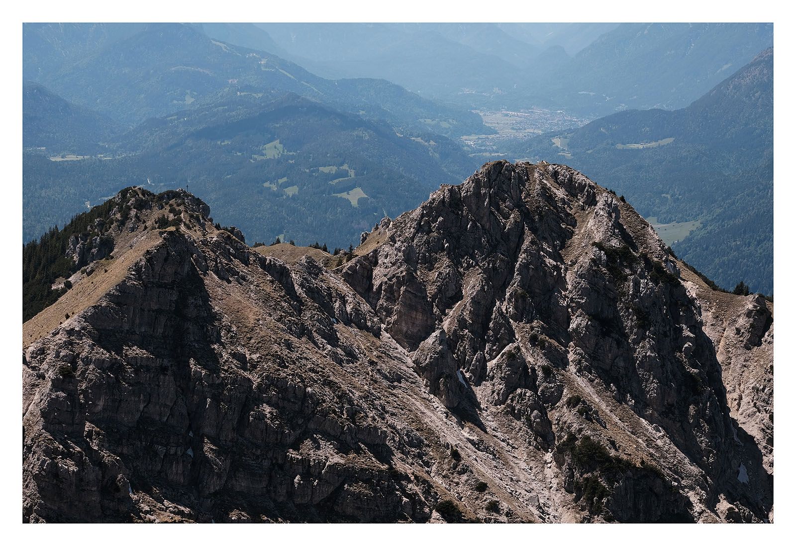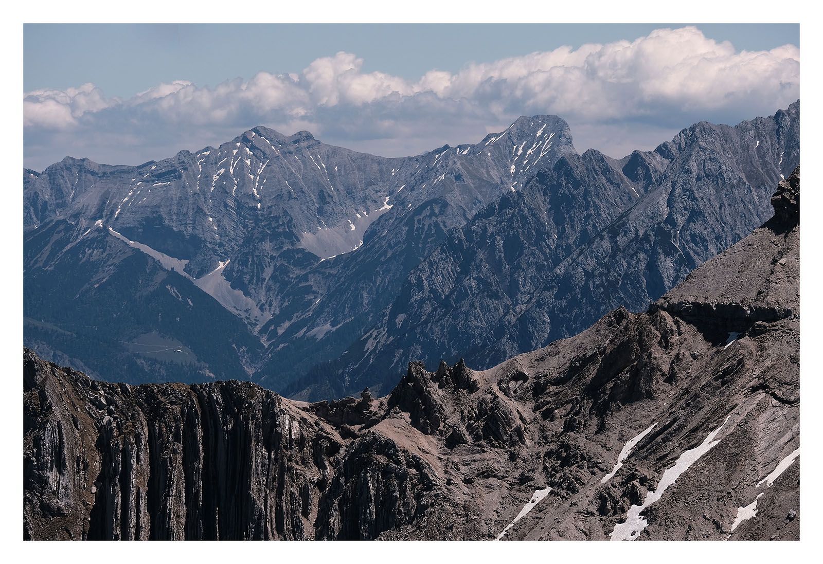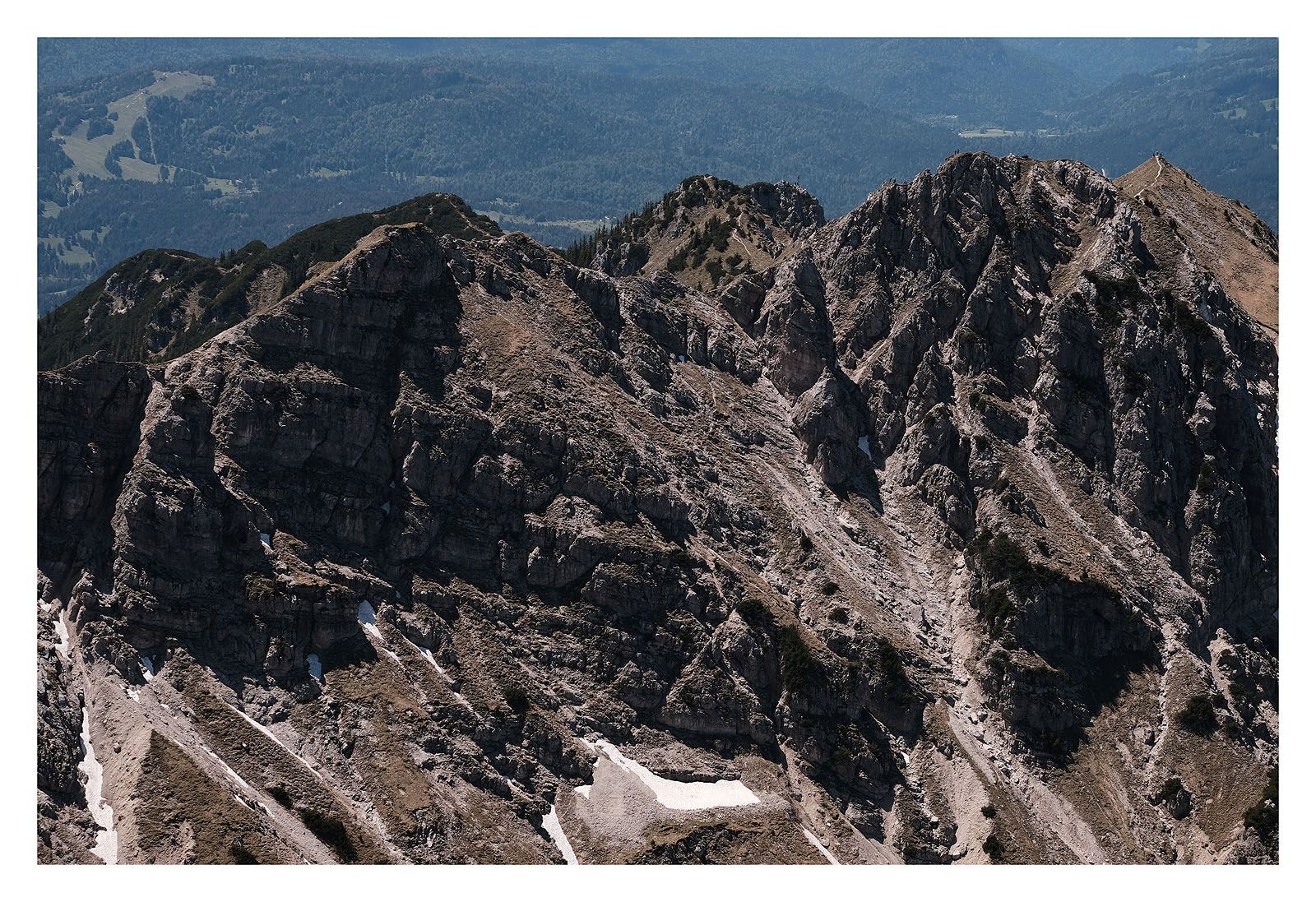 Man nähert sich dem Feldernkreuz. Es wird nicht leiser, eher lauter und die People noch zahlreicher. Ich lasse diese Gipfel aus und warte an der nahe Scharte auf mein Foto ohne wildfremde Menschen. Eine eifrige Hundeführerin gibt ihrem Fiffi beim Übergang zur Schöttelkarspitze kurze und knappe Anweisungen: „Nein – weiter – stopp – weiter – hier – da …“ Irgendwie fühle ich mich angesprochen und bin froh als ich völlig irritiert über ein allerletztes Schneefeld abkürzen kann, um schnell Land zu gewinnen.