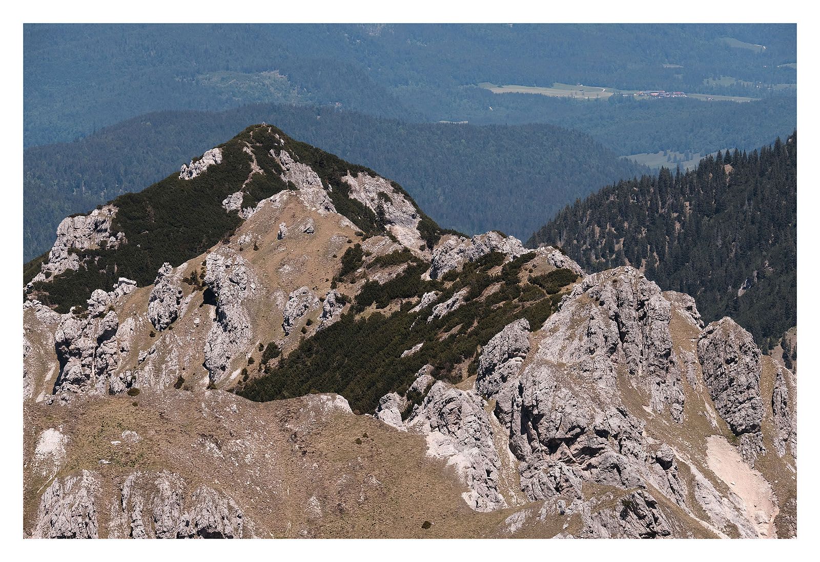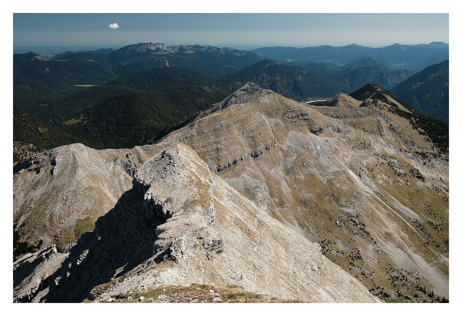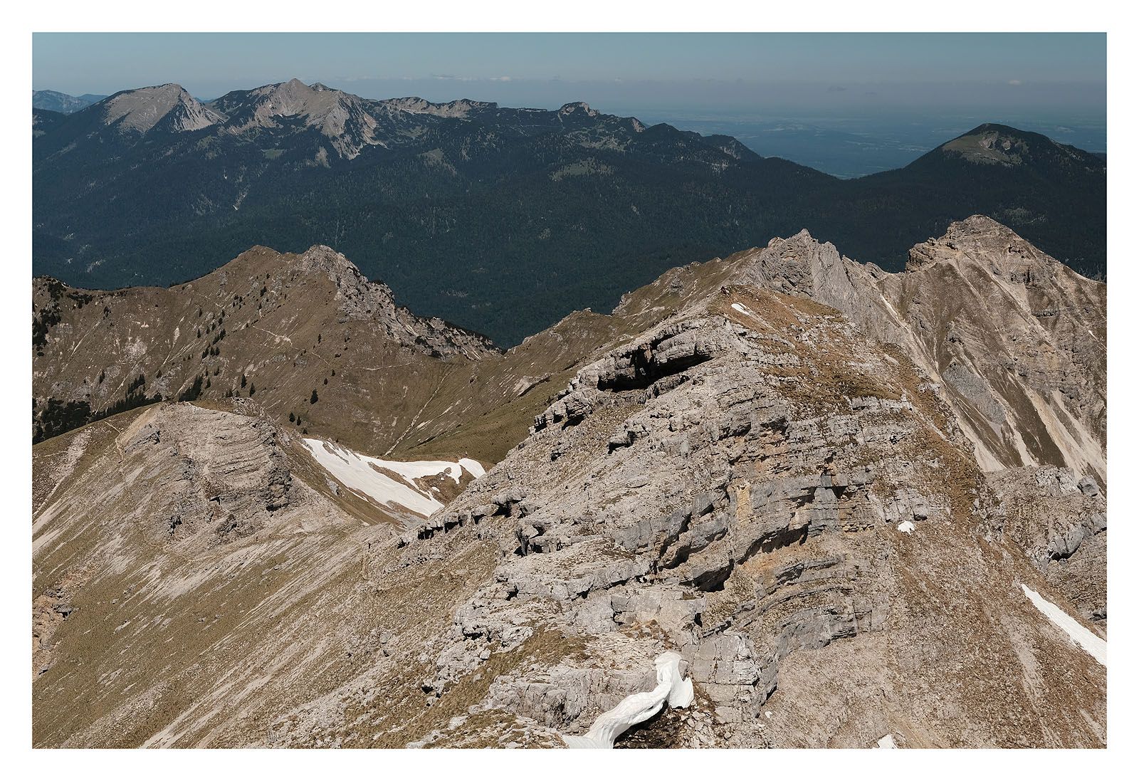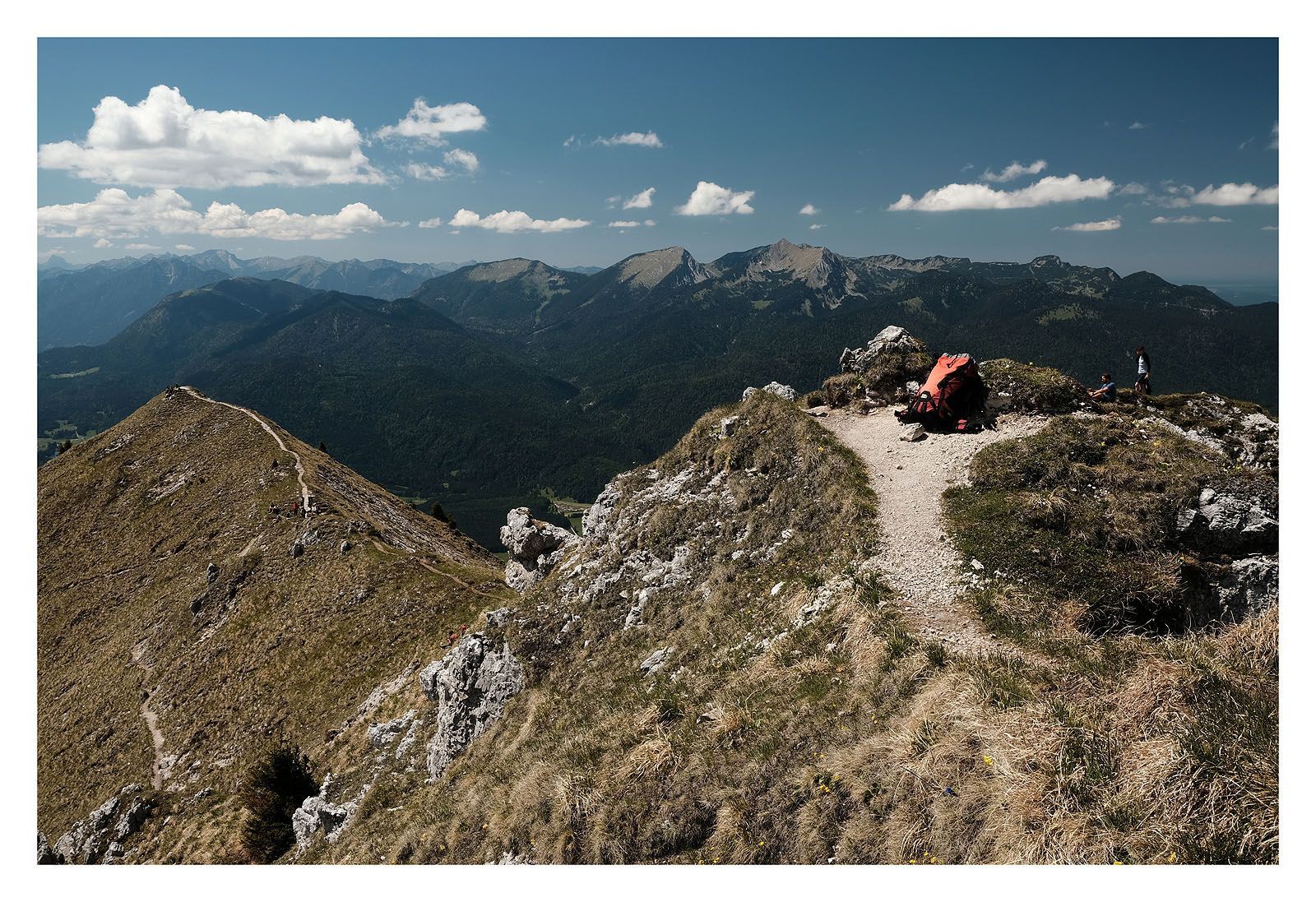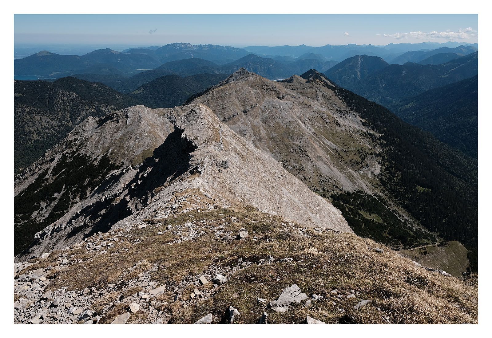Nach 1:40h passiere ich die Krinner-Kofler-Hütte. Zwei Einheimische bellen sich an. So klingt es zumindest für meine Ohren. Der Weg zieht sich durch Latschen bis zum Jöchel. Dort betritt man freies Gelände und biegt nach links zur Soiernspitze ab. Die erreiche einschließlich aller Fotostopps und einer 15-Minutenpause nach 3 ½ Stunden. Von nun an kann ich völlig entspannt und zeitlos den langen Rückweg über die höchsten Gipfel der Soierngruppe antreten.