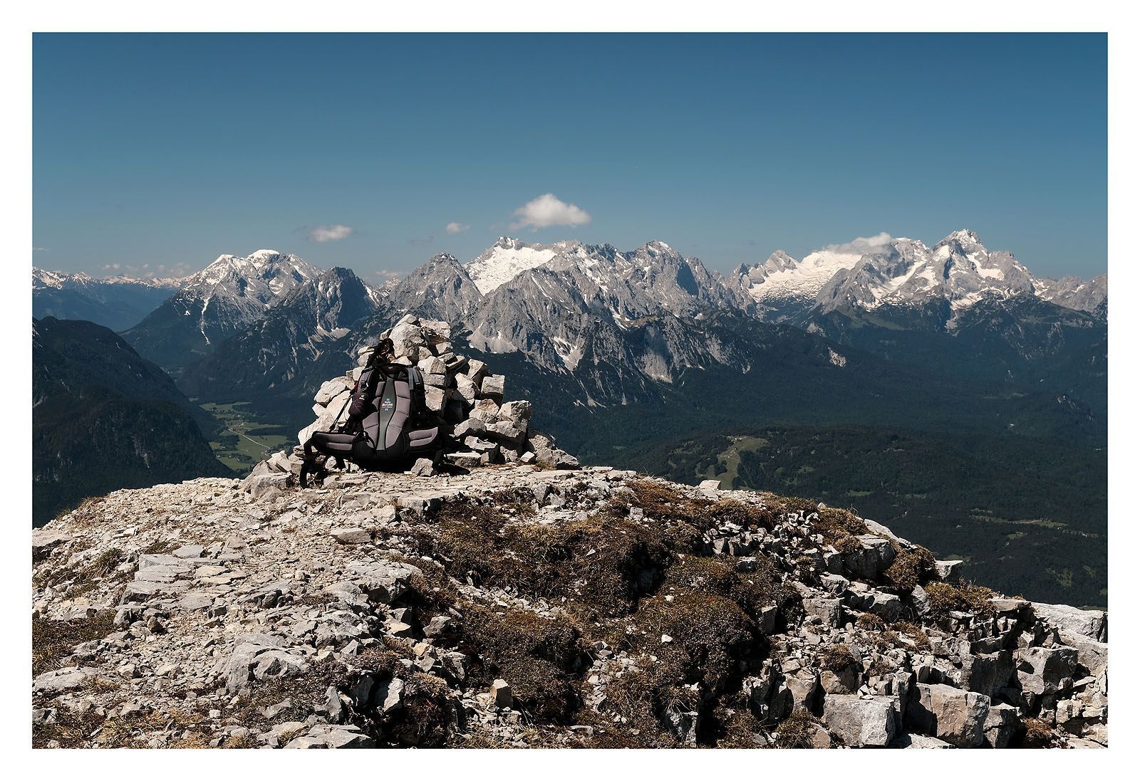 Auf der Schöttelkarspitze gibt es keine Sitzplätze mehr. Nur noch Stehplätze. Es dauert nicht lange, da bekomme ich auch schon die erste Kamera, eine ‚verhasste‘ RX100, in die Hand gedrückt. Nur kurz denke ich darüber nach, ob der Auslöseknopf möglicherweise mit Corona-Viren verseucht … ach, das ist jetzt auch schon egal. Da drückt mir schon der nächste Gelegenheitswanderer in seinen Chucks das Eifon in die Hand. „Geschenkt? Nee, war nur ein Witz! Wie immer mit Gipfelkreuz und schön scharf?“