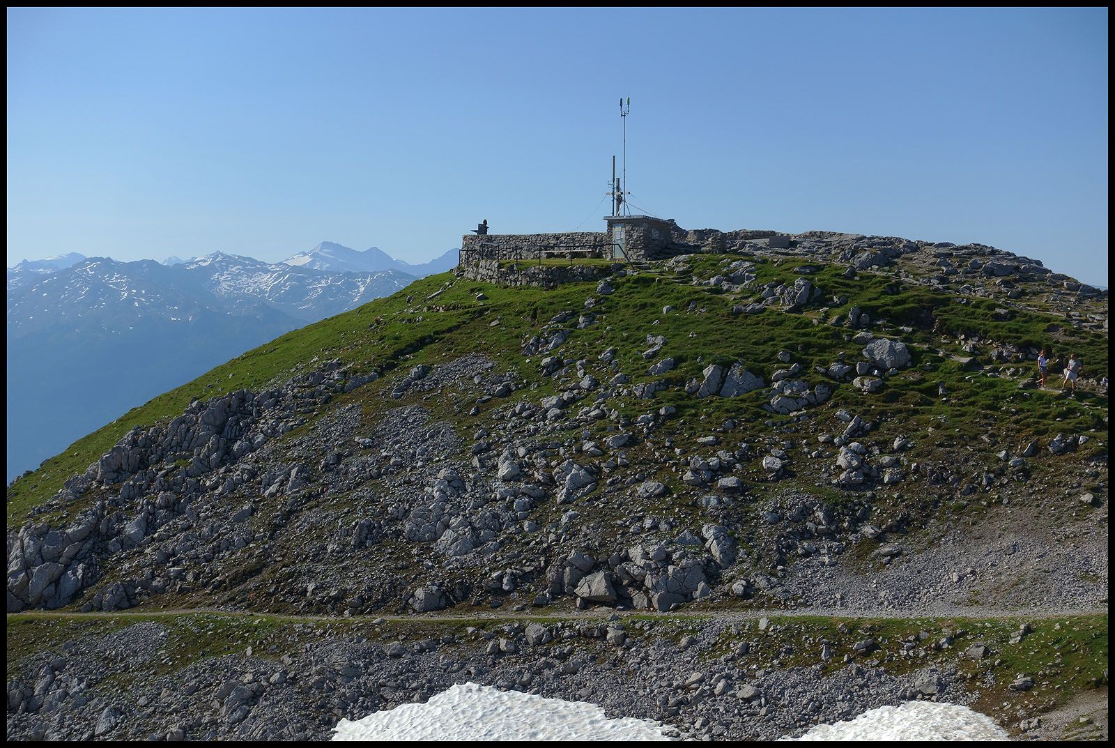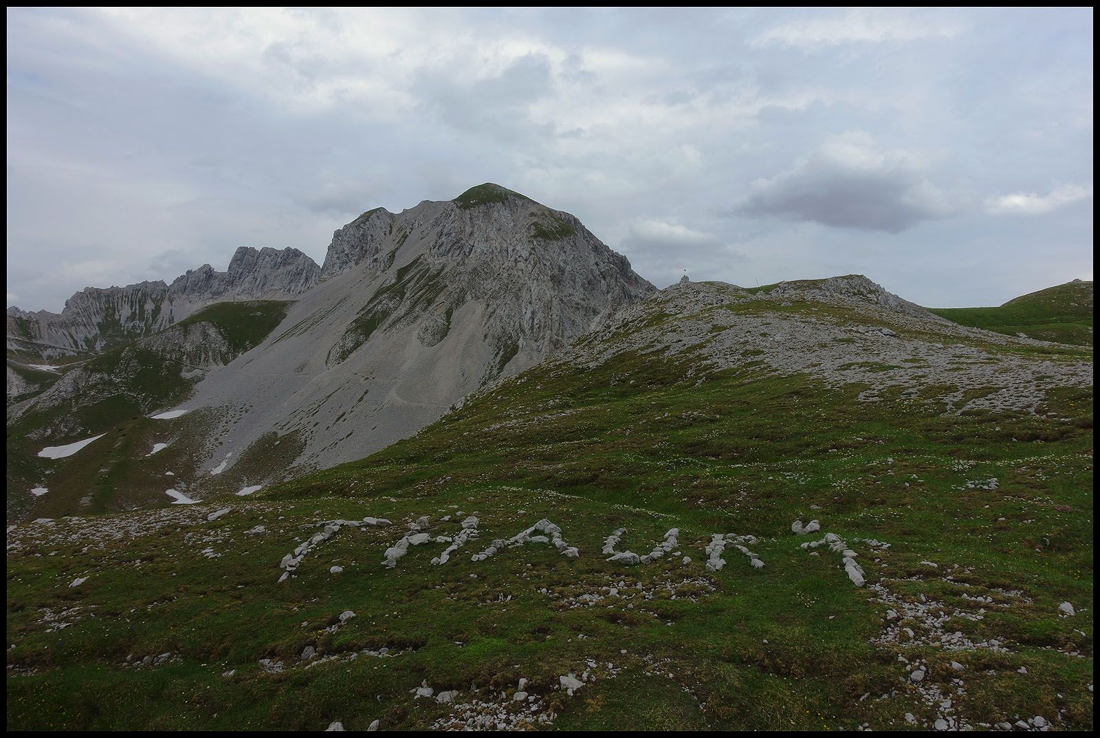 Der Gipfel des Nördlichen Gleierschtaler Brandjoches bietet dann ein plötzliches und überraschendes Kontrastprogramm. Eine schier endlose, grüne Wiese mit gelegentlichen Blumentupfern erstreckt sich unter dem blauen Karwendelhimmel (mir wird gleich schlecht von meinem eigenen Gesülze)…
