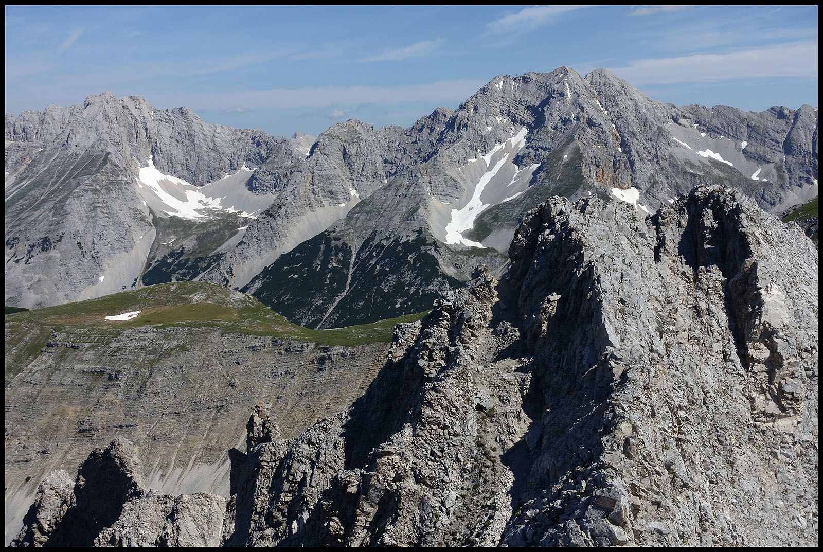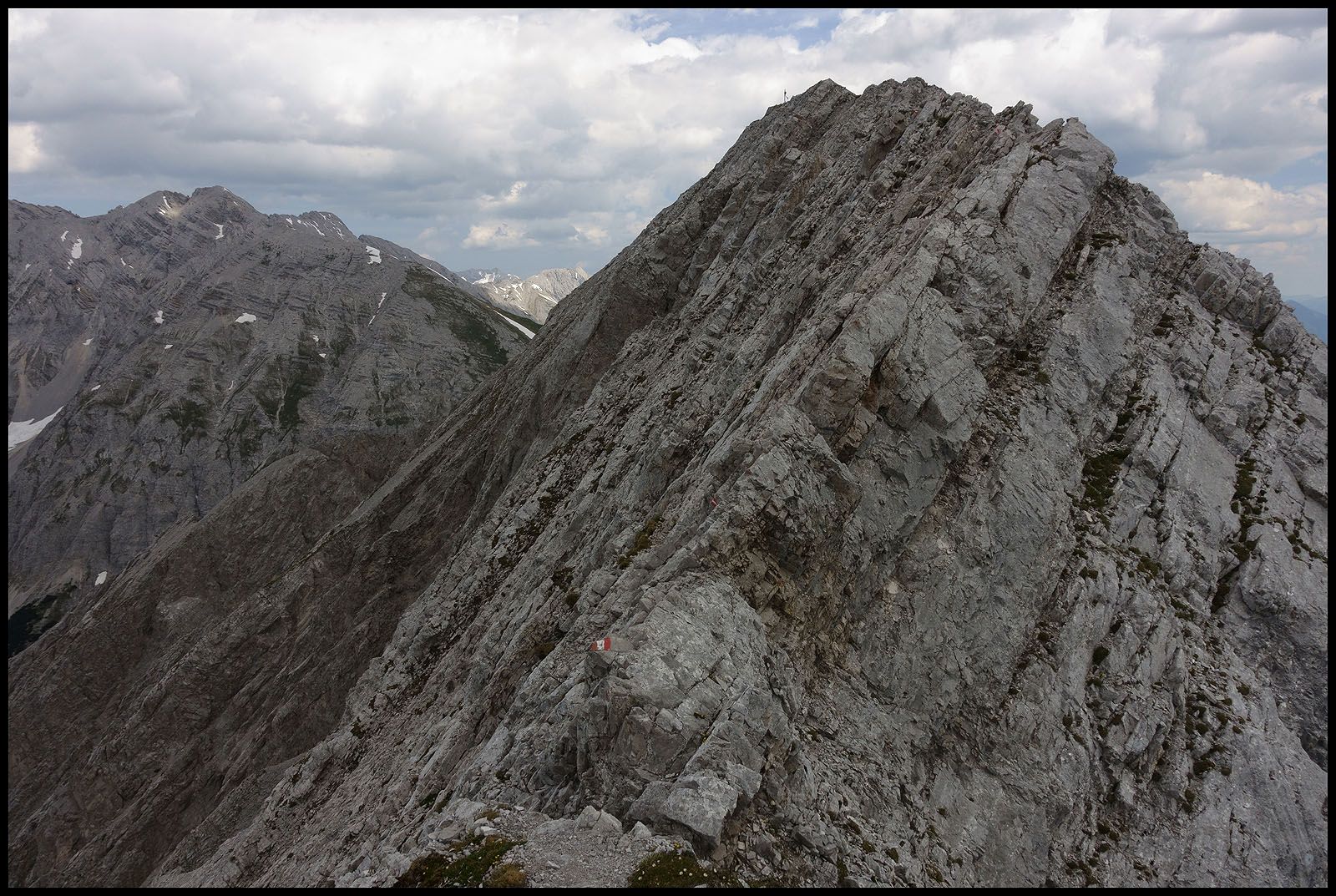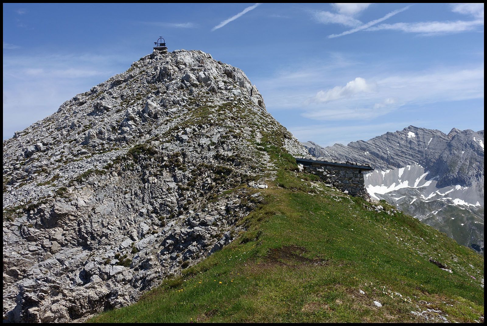 Nach dieser interkulturellen Begegnung in einer globalisierten Alpinwelt geht es auf der Ostseite der Hafelekarspitze recht gemütlich (bis T3) hinab auf den Goetheweg aka Hermann-Buhl-Weg. Der Weg schlängelt sich durch einige Schafsrudel hindurch und erreicht bald das Gleirschjöchl. Aus dem unauffälligen Sattel gelangt man leicht (T3) zum Gipfel der Gleirschspitze. Die Perspektive hat sich noch nicht sehr verändert. Der Blick auf den kompletten Wetterstein wird jedoch freigegeben. Ein sonniger Tag…