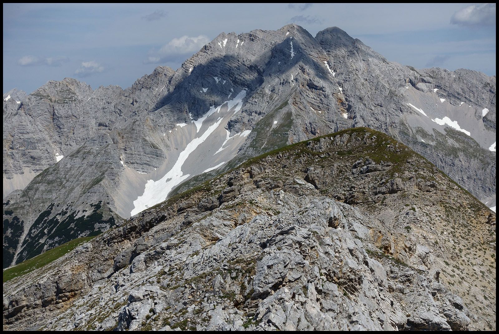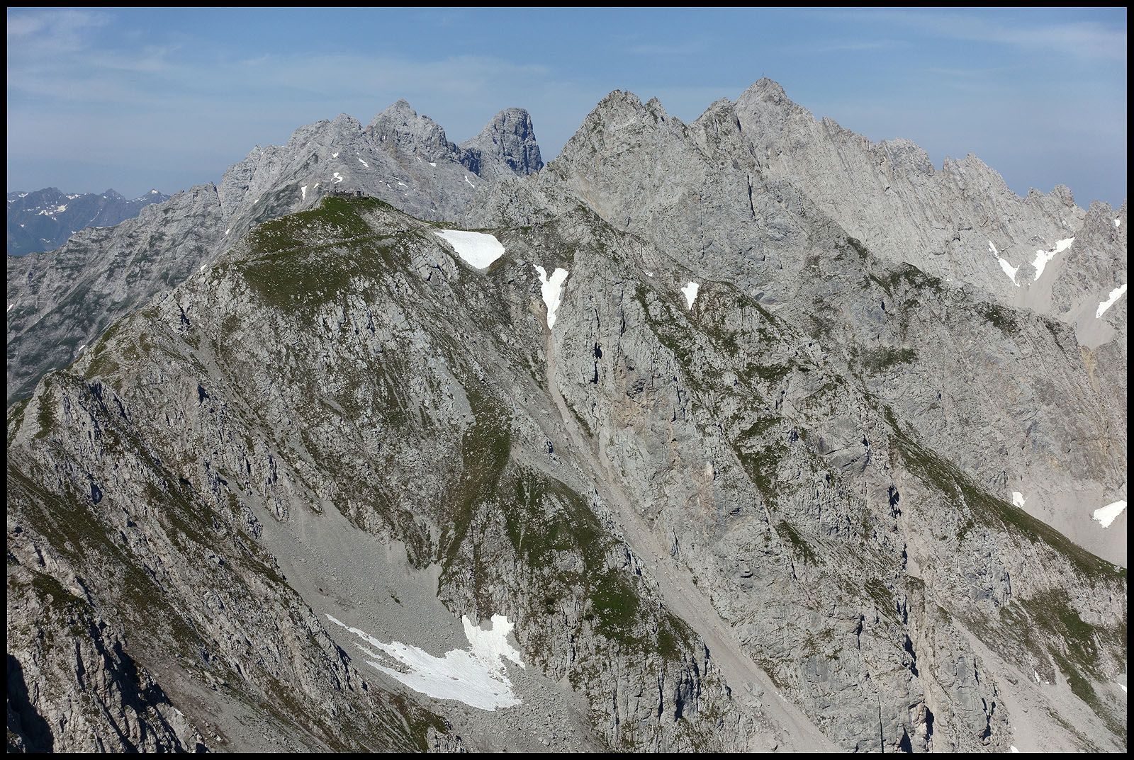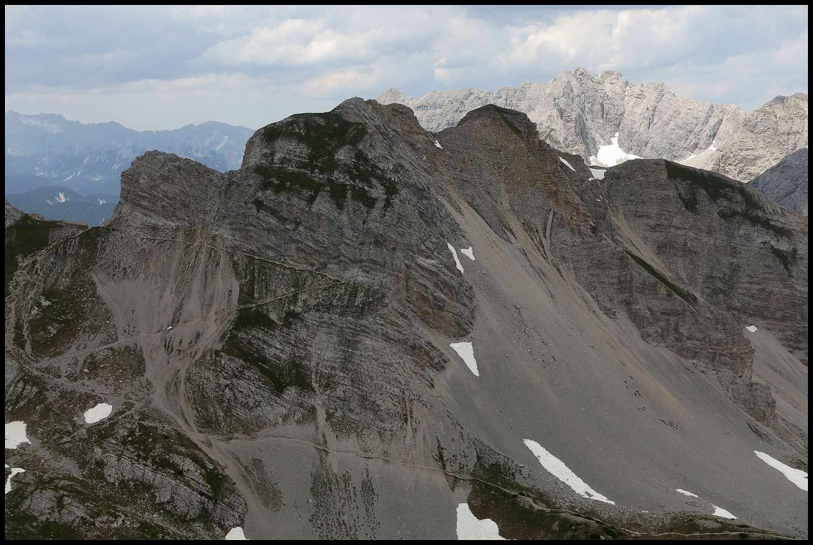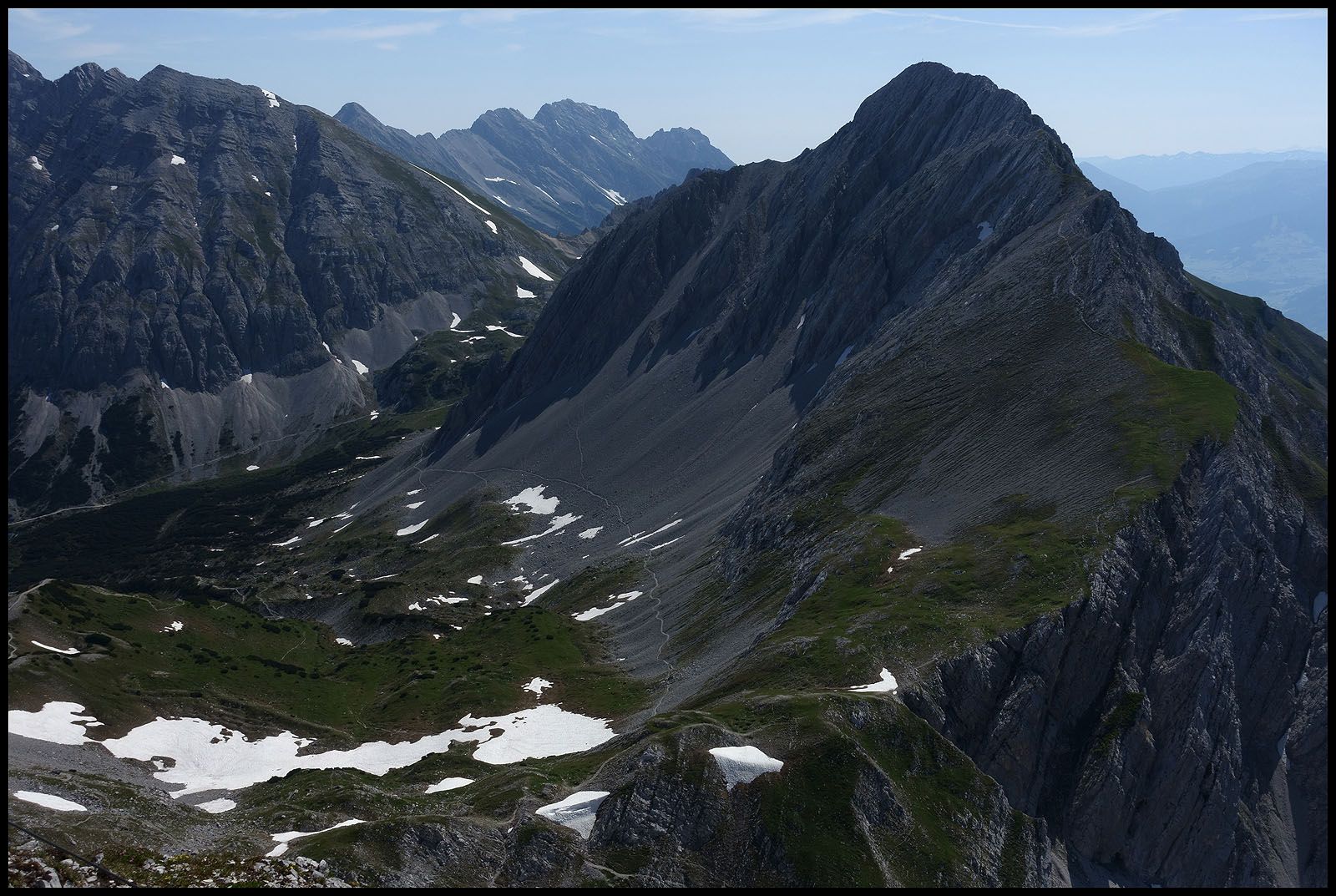 Nach dieser interkulturellen Begegnung in einer globalisierten Alpinwelt geht es auf der Ostseite der Hafelekarspitze recht gemütlich (bis T3) hinab auf den Goetheweg aka Hermann-Buhl-Weg. Der Weg schlängelt sich durch einige Schafsrudel hindurch und erreicht bald das Gleirschjöchl. Aus dem unauffälligen Sattel gelangt man leicht (T3) zum Gipfel der Gleirschspitze. Die Perspektive hat sich noch nicht sehr verändert. Der Blick auf den kompletten Wetterstein wird jedoch freigegeben. Ein sonniger Tag…