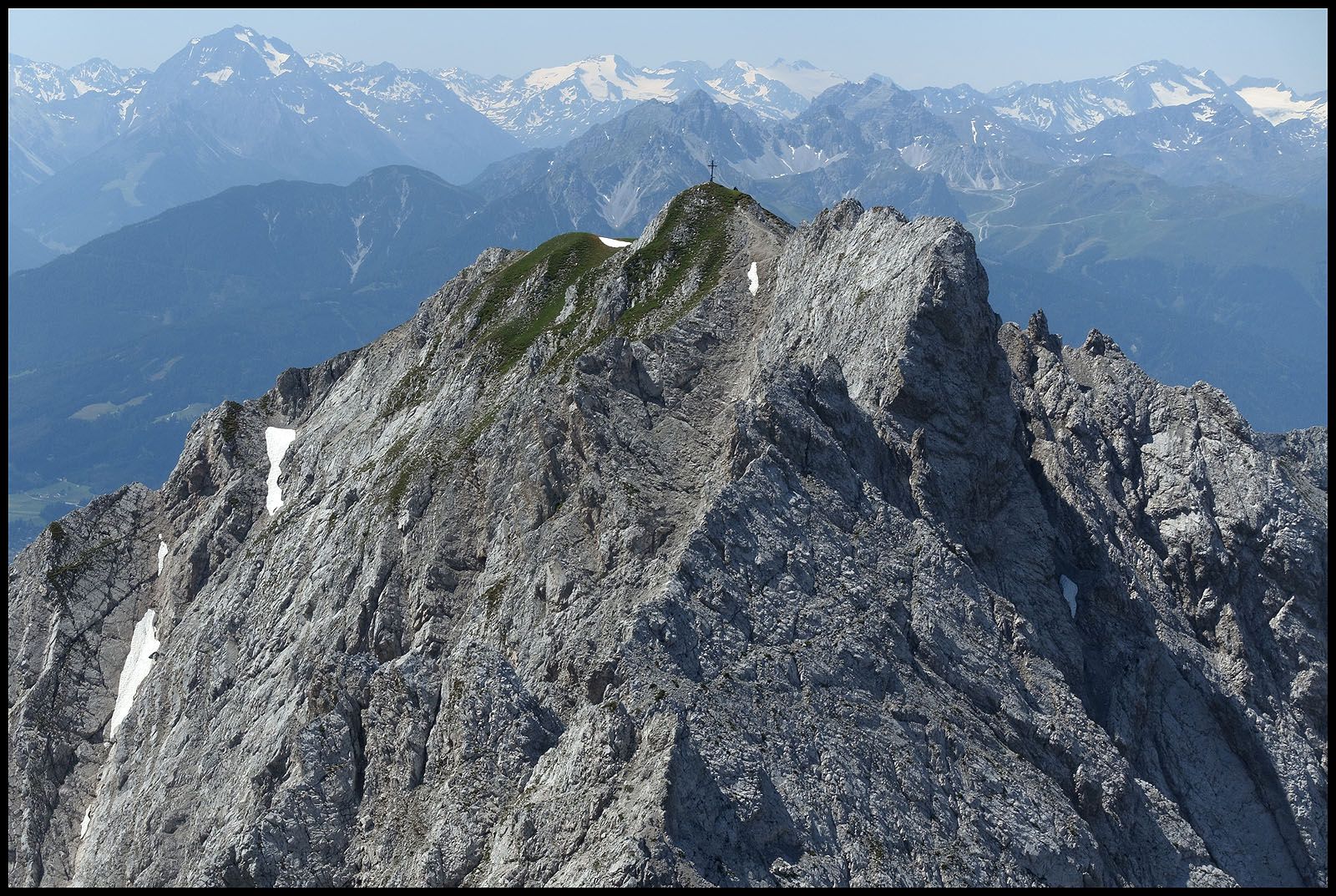 Nach einer beschwerlichen Seilbahnauffahrt ist die Hafelekarspitze nebst ihrem nur statistisch bedeutenden Nordgipfel schnell erreicht. Wie schon so oft werde ich von einer jungen Dame gebeten sie zu fotografieren. Diesmal ist es eine hübsche Asiatin, die in ihrem langen, schwarzen Kleid allerdings etwas deplatziert wirkt.