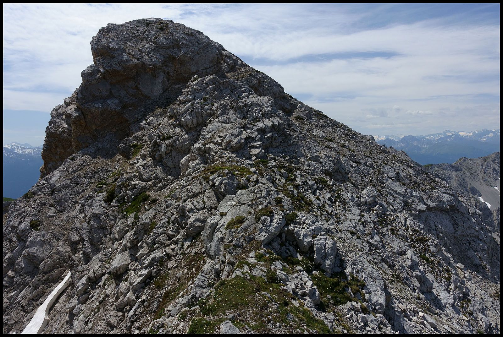Man glaubt es kaum, aber der Rückweg zum Südgipfel ist unerwartet leichter. In umgekehrter Richtung drängt sich einem der widerstandsloseste Weg direkt auf. Jetzt kanns endlich richtig losgehen mit der Rumer Spitze…