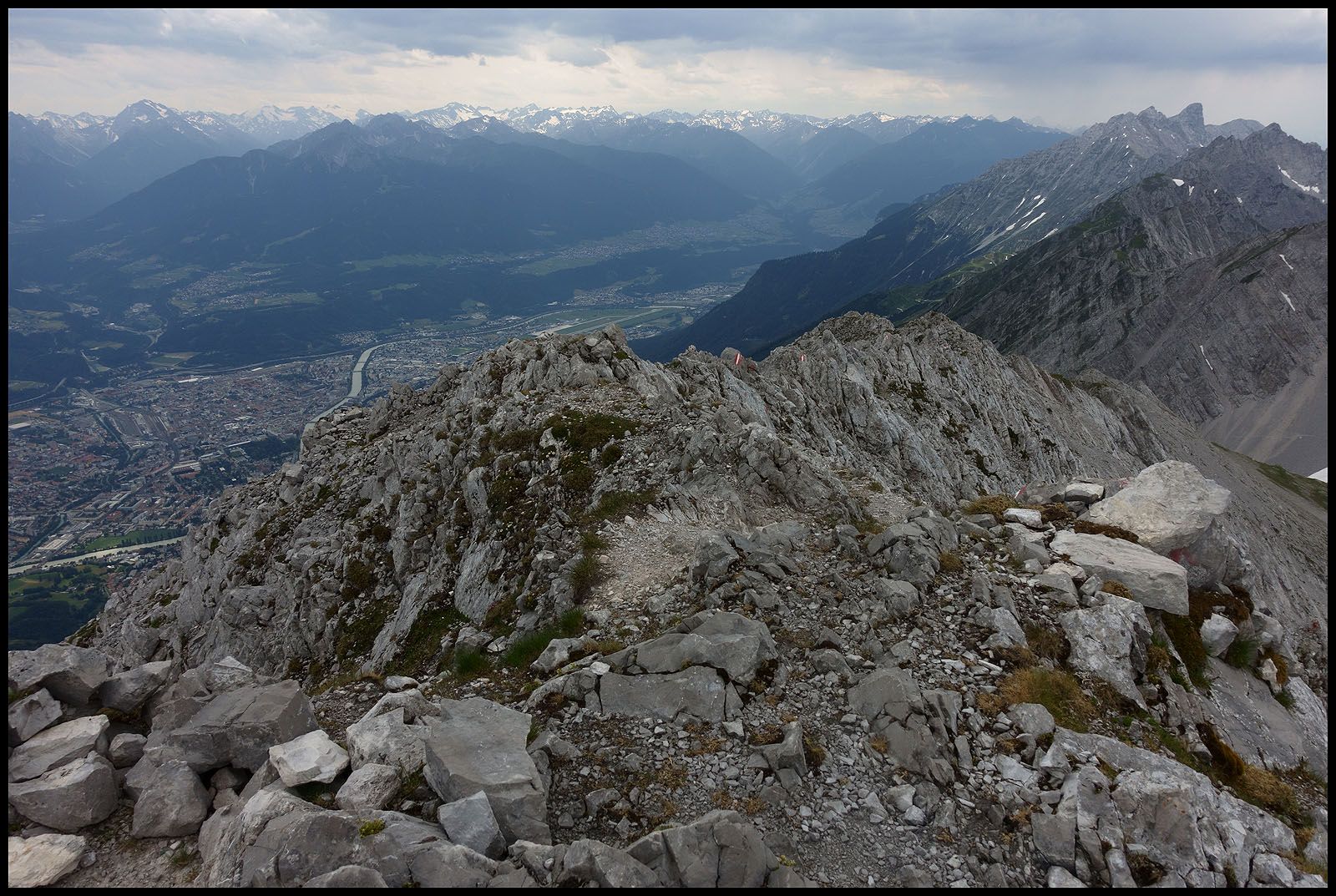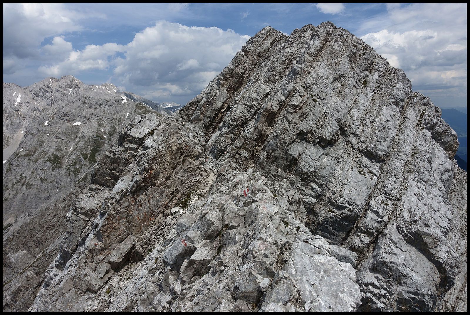 Die Rumer Spitze ist erreicht. Im Westen am Wetterstein donnern drohend die grollenden Gewitter. Das Wetter und die Zuversicht verschwinden. Lang dauert die umfangreiche Gipfelschau nicht an. Der Abstieg über den Ostgrat ist dringend geboten.