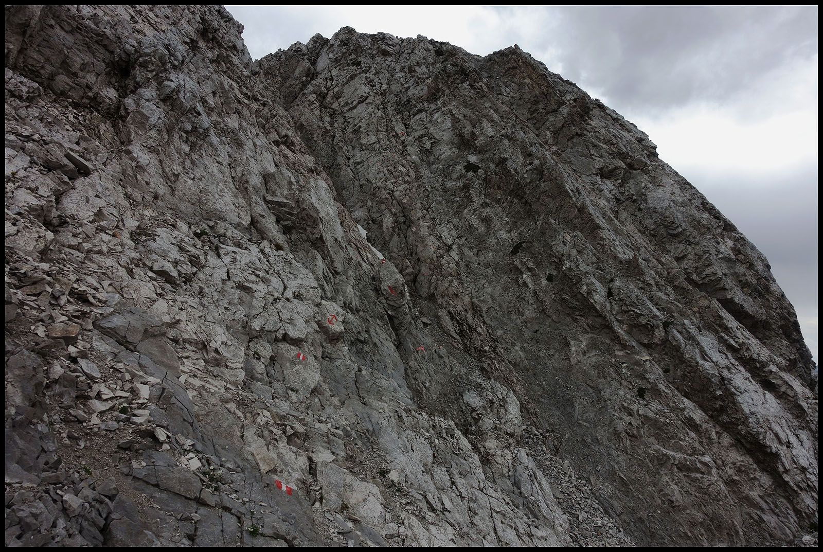 Im schrofigen und unsicheren Gelände markieren feuchte Flecken den bevorstehenden Wetterumschwung. Ein richtiger Regenguss wäre hier fatal. Das Gelände erlaubt jedoch noch kein schnelles Vorankommen. Erst unterhalb des Kreuzjöchls wird das Gelände wieder zahmer. Auch das Tröpfeln von oben hört auf…