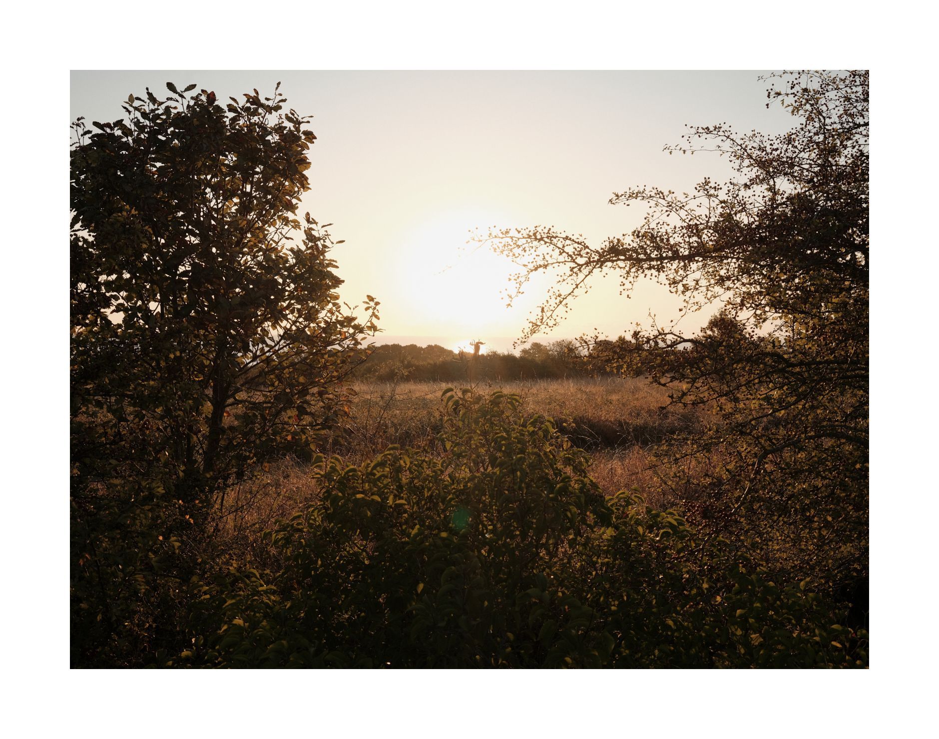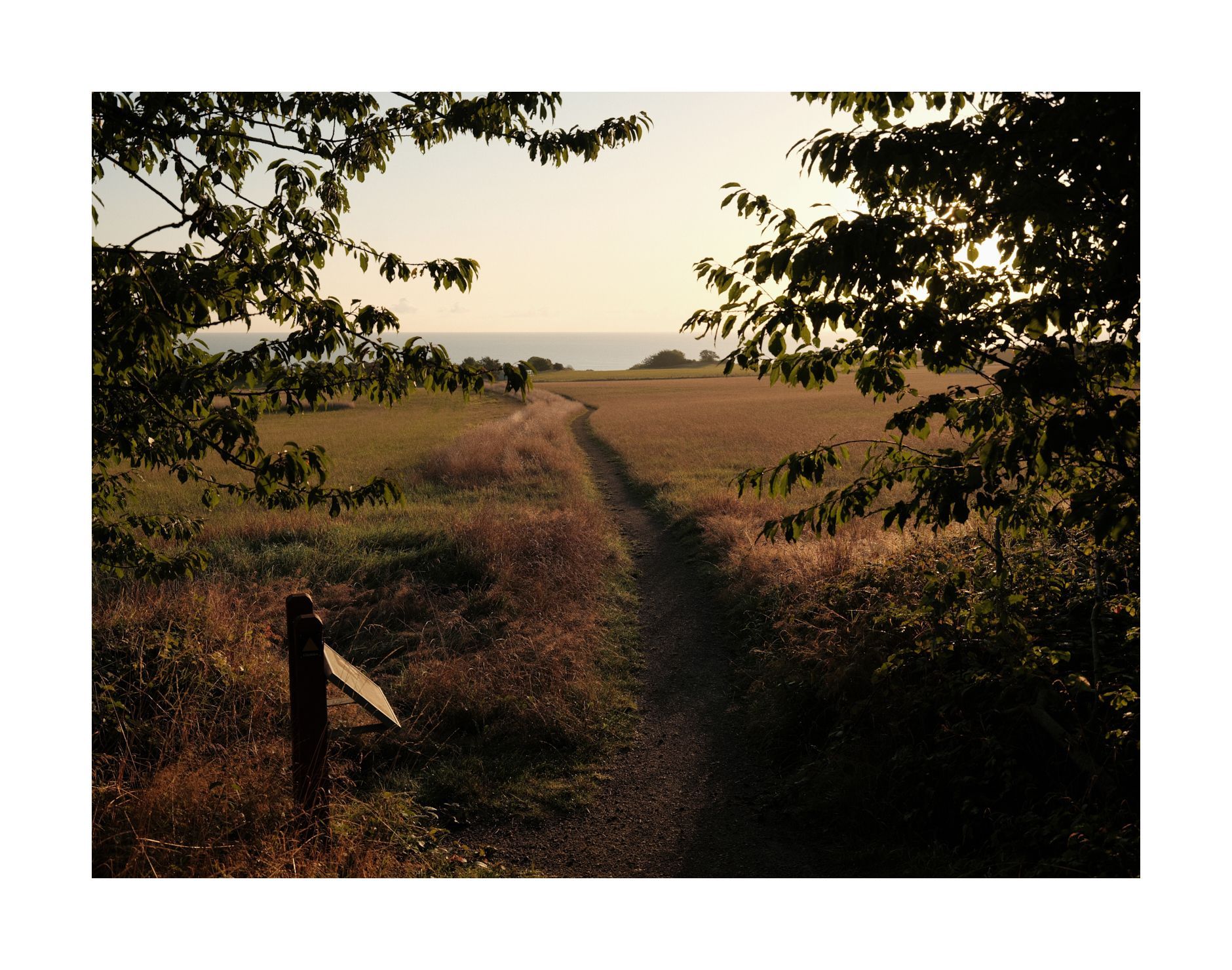 Nur fünf Minuten später habe ich Allinge nach zweimal Abbiegen bereits verlassen und ich wandere an einer Hecke entlang über eine Wiese. Die aufgehende Ostseesonne taucht die Landschaft in goldenes Licht. So fühlt es sich also an, glücklich zu sein. Vor lauter Glück hätte ich fast den Abzweig in die Wiese verpasst.