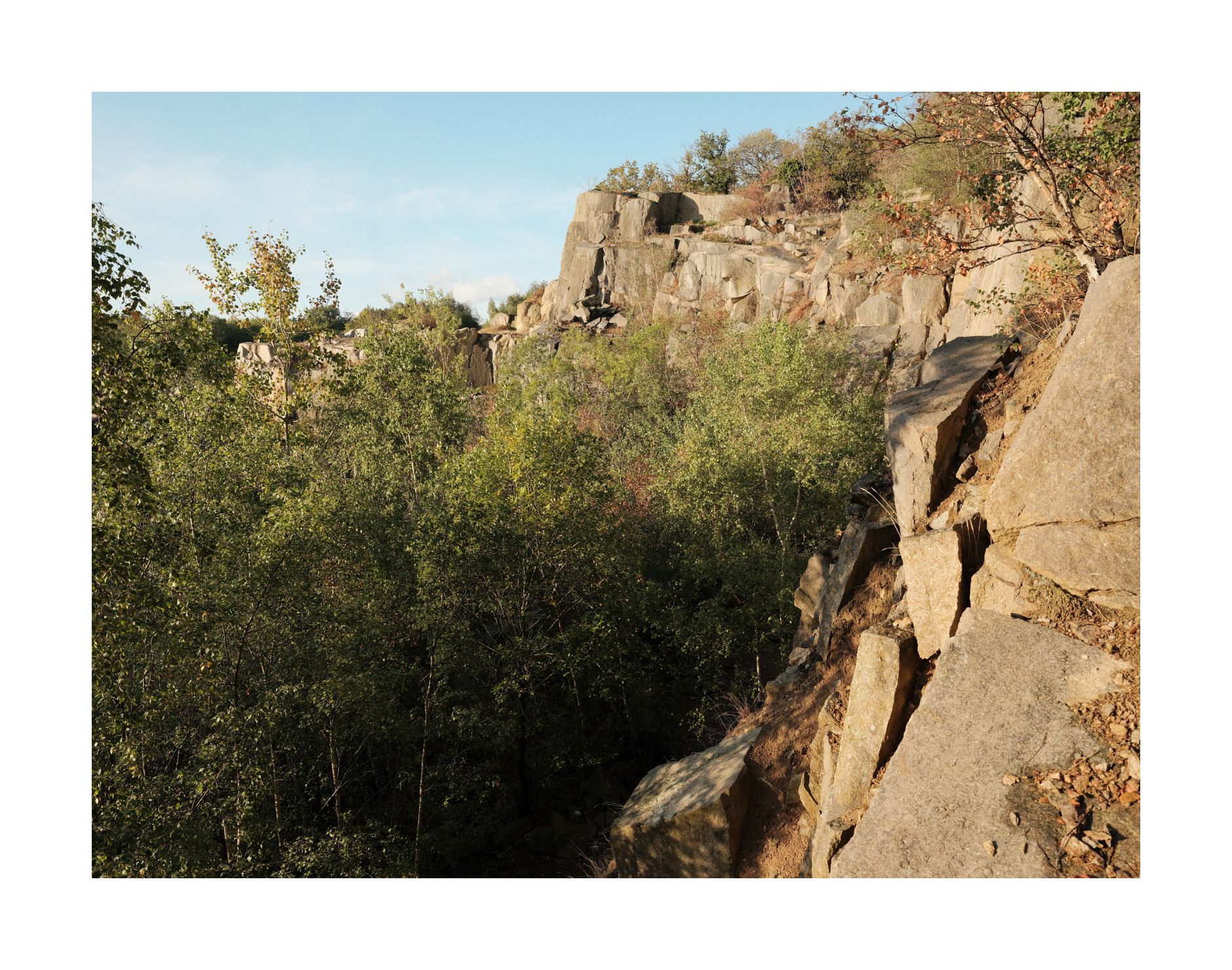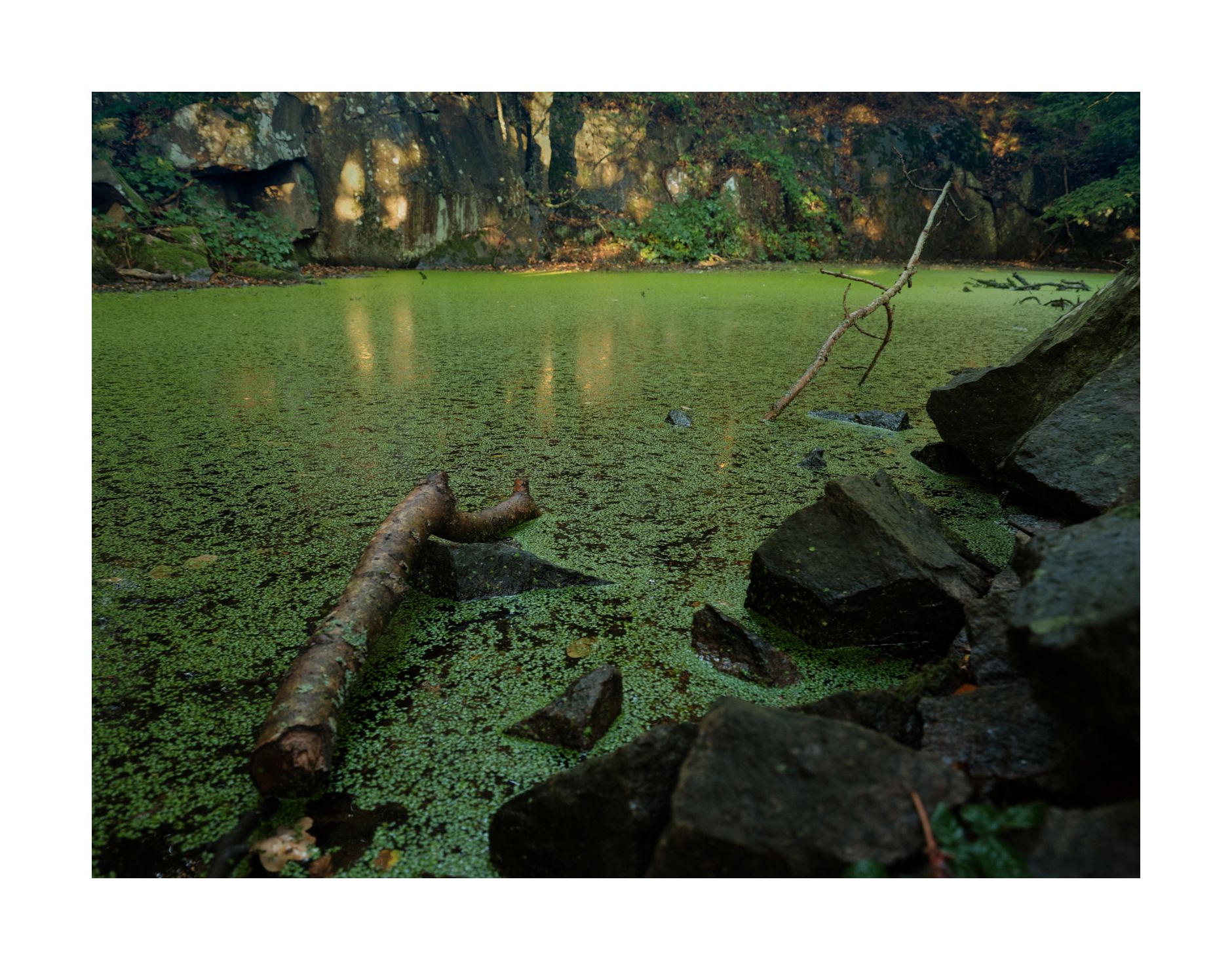 Das Zentrum eines offengelassenen Steinbruchs überrascht mit einem grünen See mitten im Wald. Alles hier, die kleinen Sehenswürdigkeiten, die vom Laub bedeckten Wanderwege, erscheint so unberührt und friedlich.