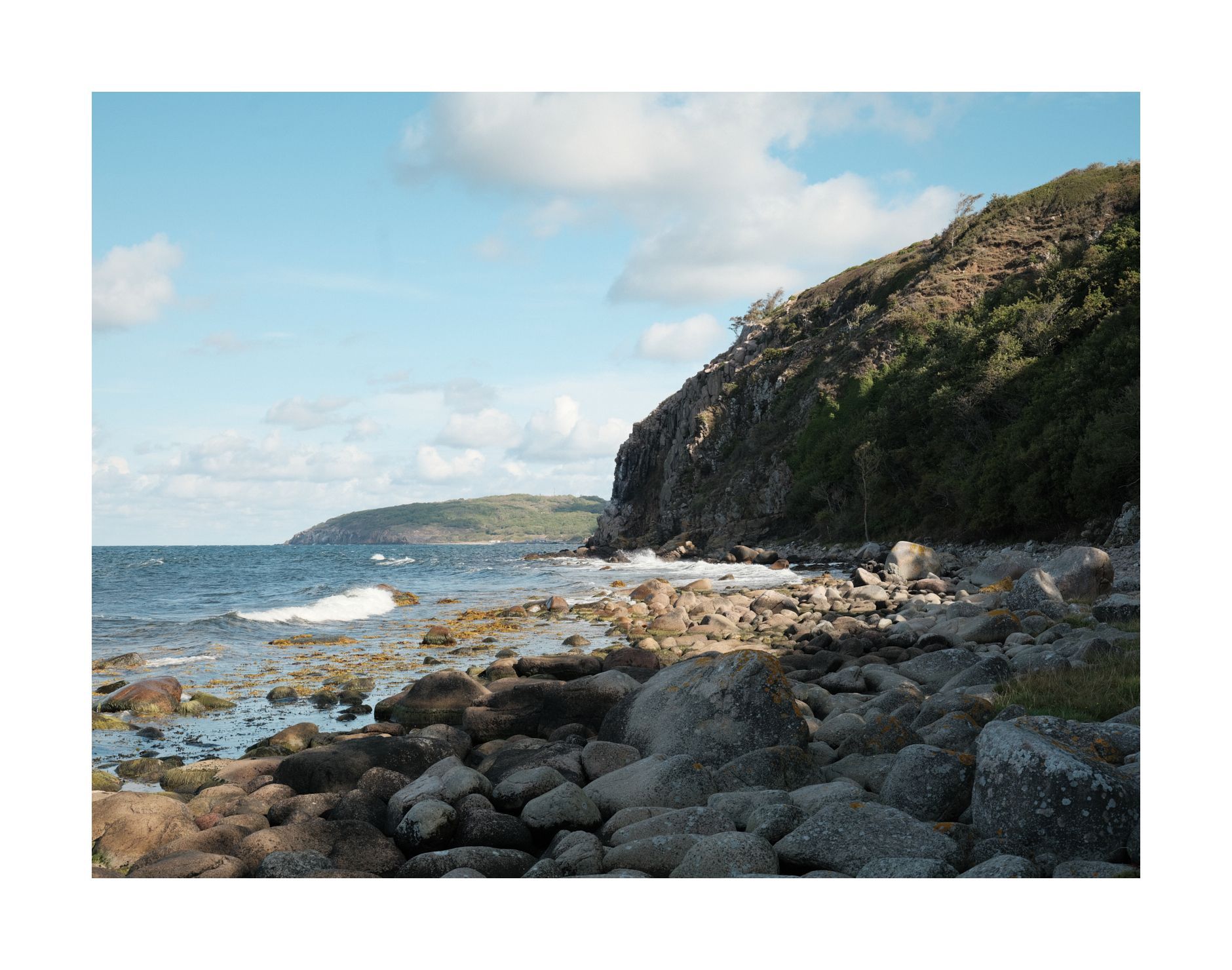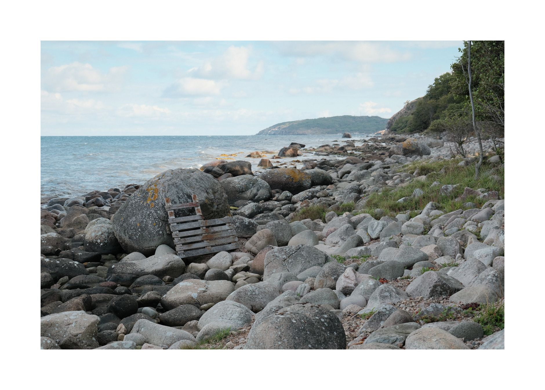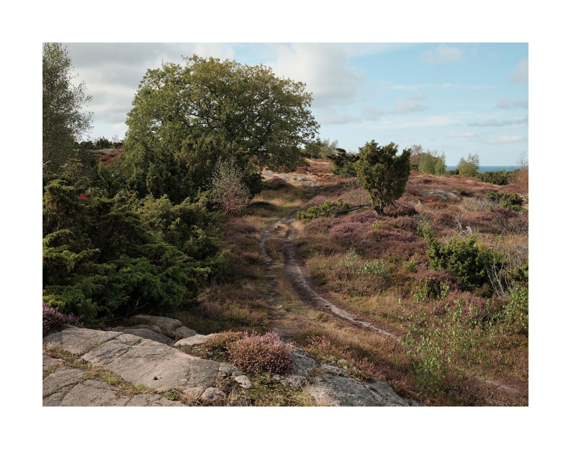 Weiter durch den Wald. Es ist ganz schön finster unter dem dichten Blätterdach. Als ich auf eine Lichtung trete, stellt sich so etwas wie Erleichterung ein. Die Slotslyngen (Schloss-Heide) liegt vor mir. Im Norden reicht der Blick bis zur schwedischen Landmasse. Im leichten Auf und Ab geht es mehr abwärts auf Vang zu. Der Anleger des ehemaligen Granitsteinbruchs ragt wie ein Fragezeichen in die Ostsee hinaus. Vang werde ich heute jedoch nicht ganz erreichen.