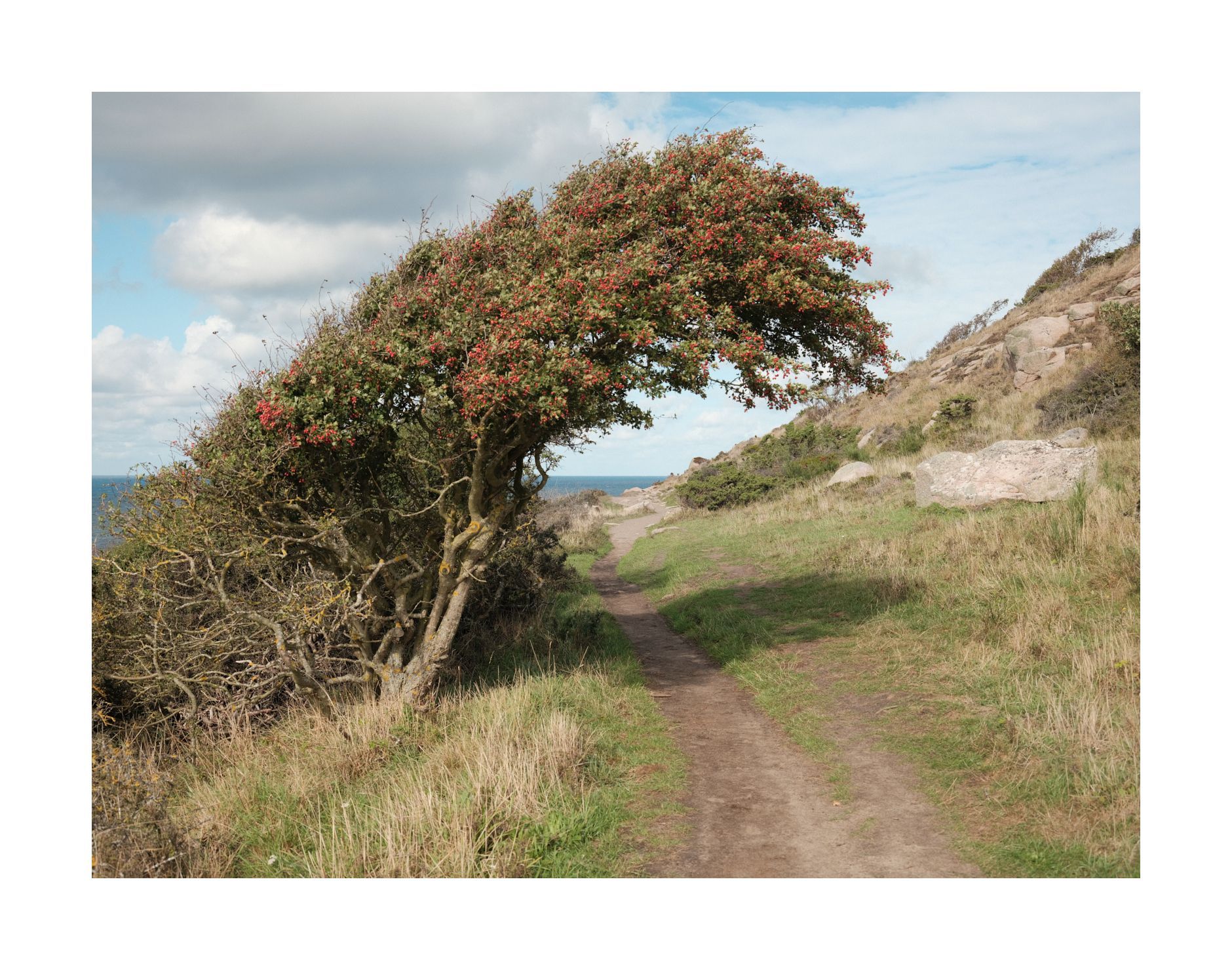 Der Apfel von heute Morgen ist schon lange gegessen. Zu meinem Glück ernährt Bornholm jedoch seine Bewohner und Besucher. Ich futtere Brombeeren und zahlreiche wilde Äpfel. Von den Wacholderbeeren lasse ich jedoch die Finger. Sieht zwar aus wie Blaubeeren, macht aber - soweit mir bekannt - roh verzehrt Bauchschmerzen.