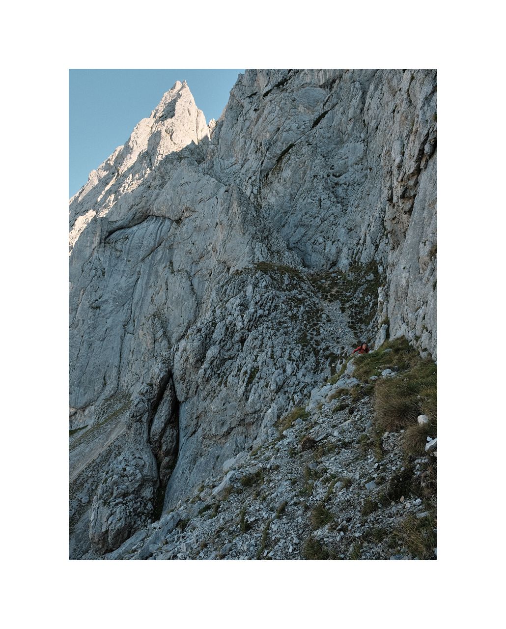 Den Einstieg finden wir dennoch nicht. Wir sind schon kurz davor aufzugeben, weil uns auch die Zeit davonrennt, als mich der Ehrgeiz packt und ich doch nochmal in der Spur der Steinböcke zur Felswand aufsteige. Hinter einem Felsen führt eine Rampe hinauf und dort glänzt auch ein Haken: der Einstieg in den Südgrat des Stangenspitz!
