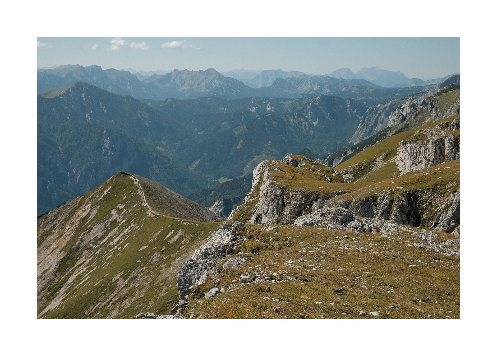 Zeit für Butterbrote mit Ausblick. Zwei Hiesige kommen auch dazu. Der eine fotografiert und so kommen Nikon-man und Fuji-san gleich ins Gespräch. Der andere Hiesige kennt sich gut aus und erfreut uns mit einem sehr spannenden 360°-Gipfelklugscheißen. Sogar eine Ecke von der Rax gibt es zu sehen.