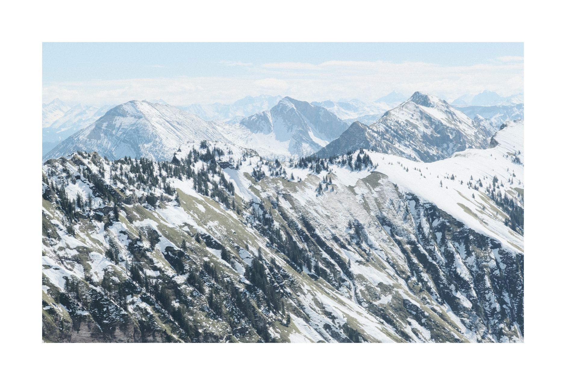 Gipfel. Für die Aussicht hat sich die Anstregung gelohnt. Karwendel und Rofan zeigen sich im winterlichen Schneekleid. Schnee bis zum Horizont. Nur der Wind schmälert die Gipfelfreude. Bei den Böhen gelingt es mir kaum die Kamera still zu halten. Ich schalte die IS ein und fotografiere 360° um mich herum ab. Ein paar Sekunden schaue ich noch dumm in die weiße Welt, steige dann aber etwas ab, um eine Gipfelrast an einem etwas windstilleren Plätzchen einzulegen.