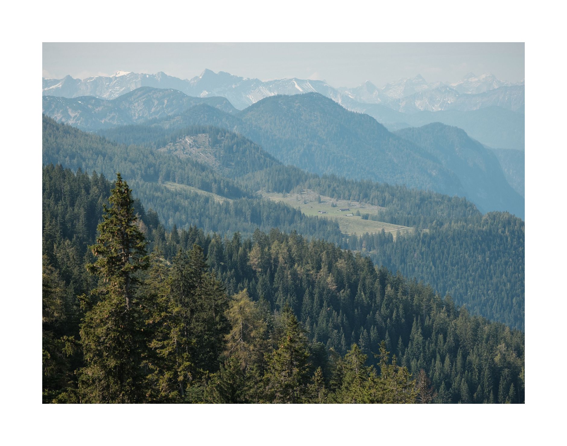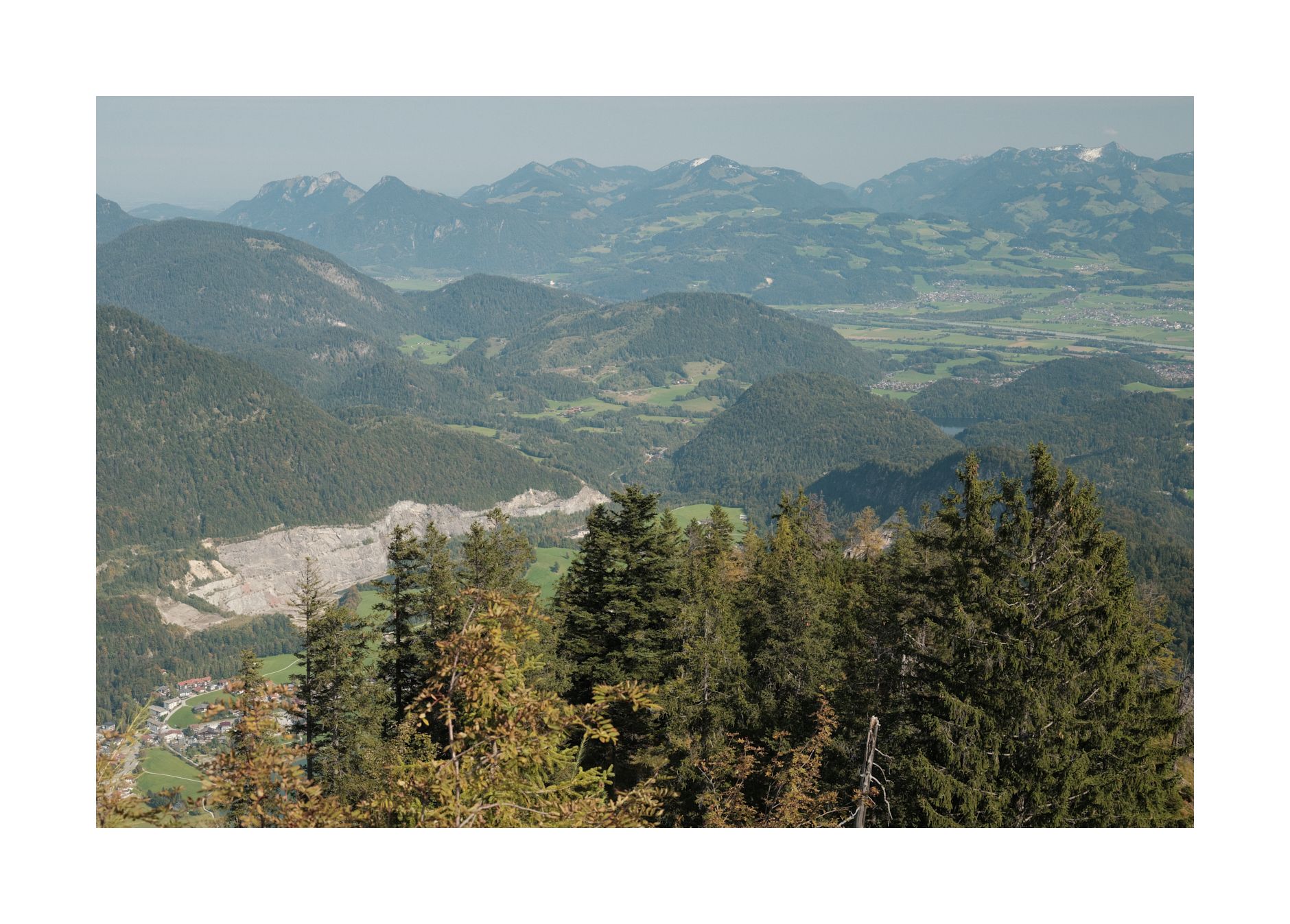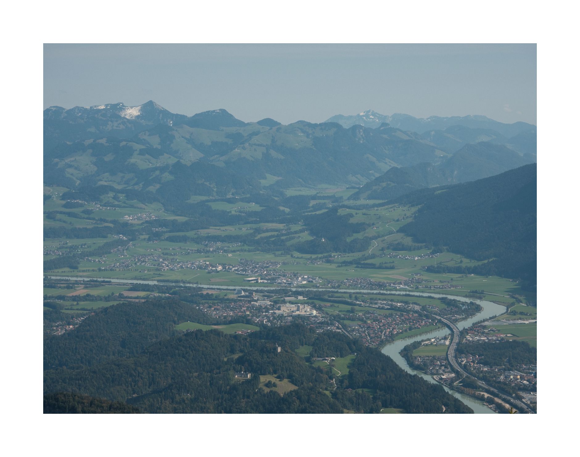Pendling und Pendlinghaus halten hingegen das Versprechen eines großartigen Ausblicks. Ich hänge hier lange herum und experimentiere mit der Kamera. Zuletzt komme ich zu der Schlussfolgerung, dass der Pendling besser ein Berg für den Nachmittag und Abend ist. Dann erhält der Kaiser Licht aus Westen, der Hauptkamm wird nicht mehr von der hellen Mittagssonne überstrahlt und die Konturen der Chiemgauer Alpen kommen besser zur Geltung. Der weite Abstieg über die breite Forststraße ist auch sicher bei Dunkelheit gut möglich. Eine Übernachtung im Pendlinghaus wäre auch denkbar. Bei Vollmond schimmert der Kaiser bestimmt sehr schön und wer hat schon die Lichter von Kufstein in der Nacht von oben gesehen? Über die breite Forstraße könnte man auch im Winter leicht mit Schneeschuhen aufsteigen...