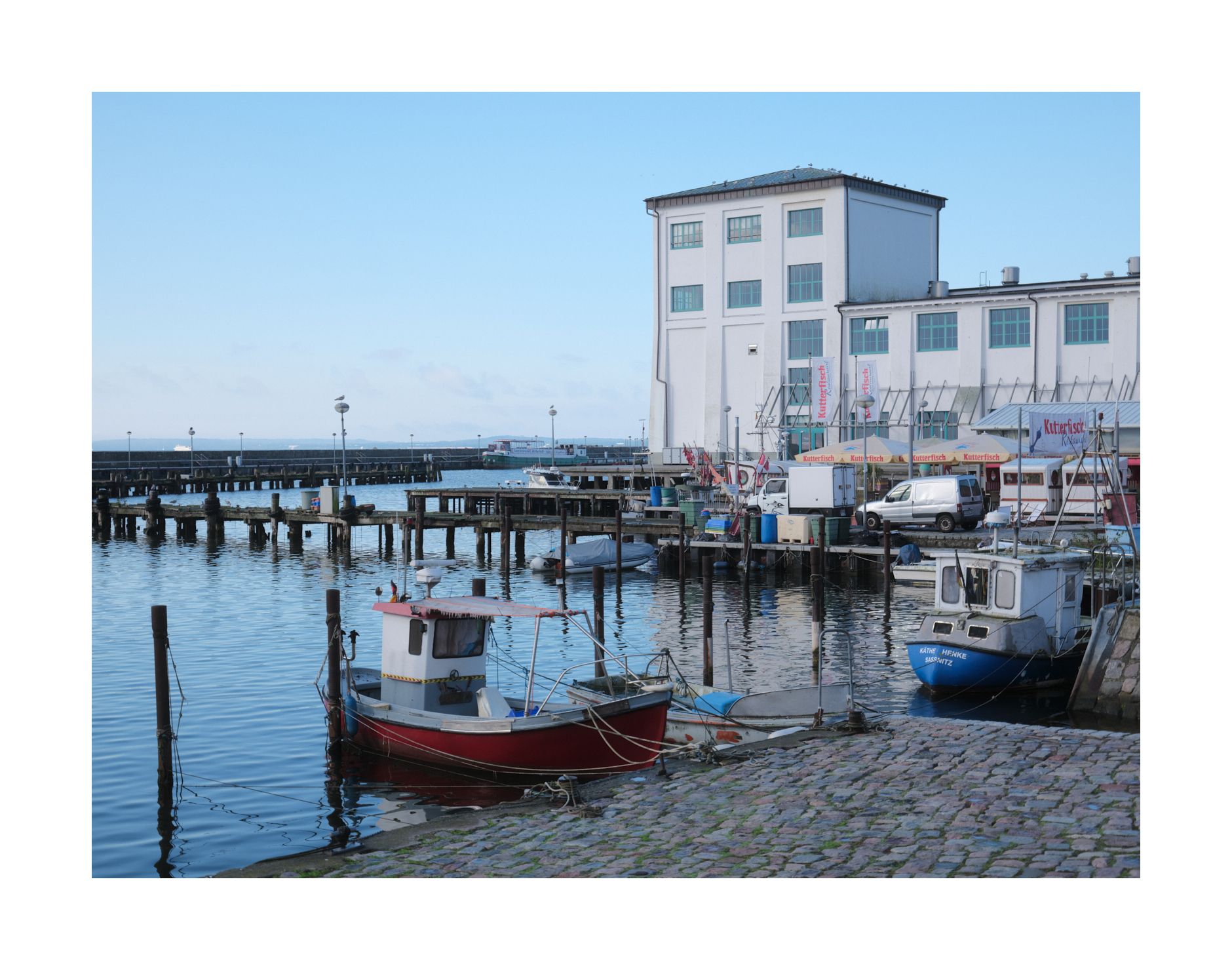 Direkt am Hafen finde ich einen Parkplatz, auf dem man mit Parkscheibe 30 Minuten kostenlos parken kann. Für mehr Zeit müsste ich weiter zu Fuß gehen. Eilig schnappe ich mir die Kamera und eile auf die Uferpromenade zu. Der Straßenbelag wechselt urplötzlich von Kopfsteinpflaster über einen schmalen Streifen Waschbetonplatten zu Holzbohlen. Nassen Holzbohlen! Mir zieht es zunächst einen Fuß weg, dann den anderen. Ich liege waagerecht in der Luft. Wie in Zeitlupe muss ich erleben, dass die 'Dicke Bertha', mein geliebter Fotoapparat, zunächst mit einer Gehäuseecke auf den Holzbohlen einschlägt, nocheinmal elastisch zurückfedert und dann endlich auf dem nassen Boden liegen bleibt. Ein Passant fragt, ob ich Hilfe benötige. Ich prüfe jedoch zuerst, ob die Kamera noch funktioniert. Kein Kratzer, keine Delle, nichts abgebrochen. Einschalten geht auch noch. Der AF stellt scharf. Ich bin beruhigt und bemerke erst jetzt, dass rechtsseitig Knie, Hüfte und Arm schmerzen. Zumindest kann ich weiterhumpeln und ich hoffe, dass sich unter der Kleidung nicht doch klaffende Wunden befinden, aus denen arterielles Blut pulsierend austritt.
