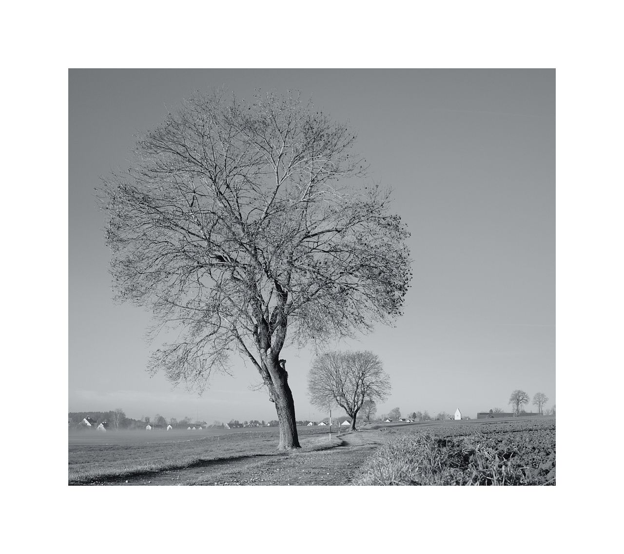 Auf dem Weg komme ich wieder an der Brücke über den Rothbach vorbei. Klick! Nicht uninteressant bei Nebel. Die Sonne kommt gerade heraus und erst jetzt steigen die Nebel aus den Wiesen und Feldern auf. Das Licht ist weich. Hoffentlich hält das noch so lange an, bis ich den Weg und die Bäume erreiche.