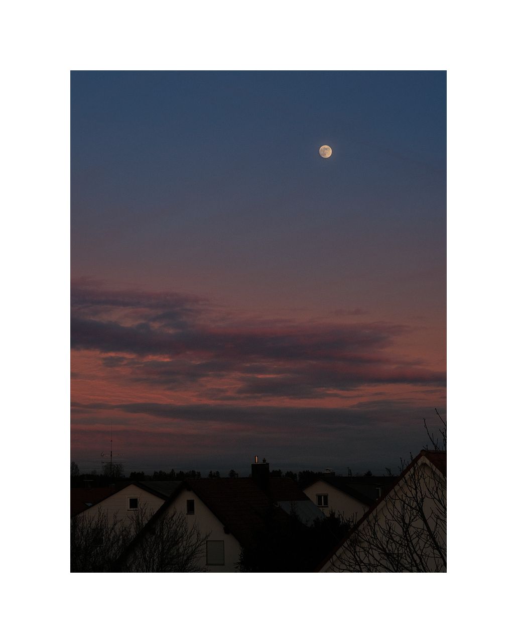 Seit Tagen weht schon ein kräftiger bis stürmischer Wind mit Böen bis 60 km/h. Das bekomme ich zu spüren, als ich das Dachfenster vorsichtig öffne. Zum Glück befindet sich die Mondszene im Nordosten und der Wind kommt aus Westen. Der Stabi des Objektivs hat dennoch alle Hände voll zu tun.