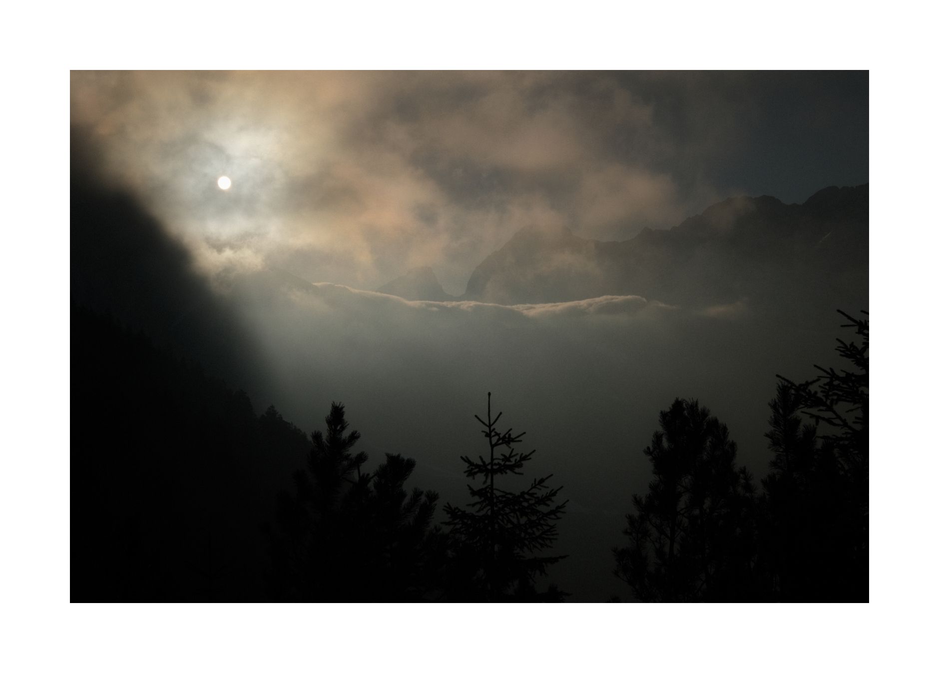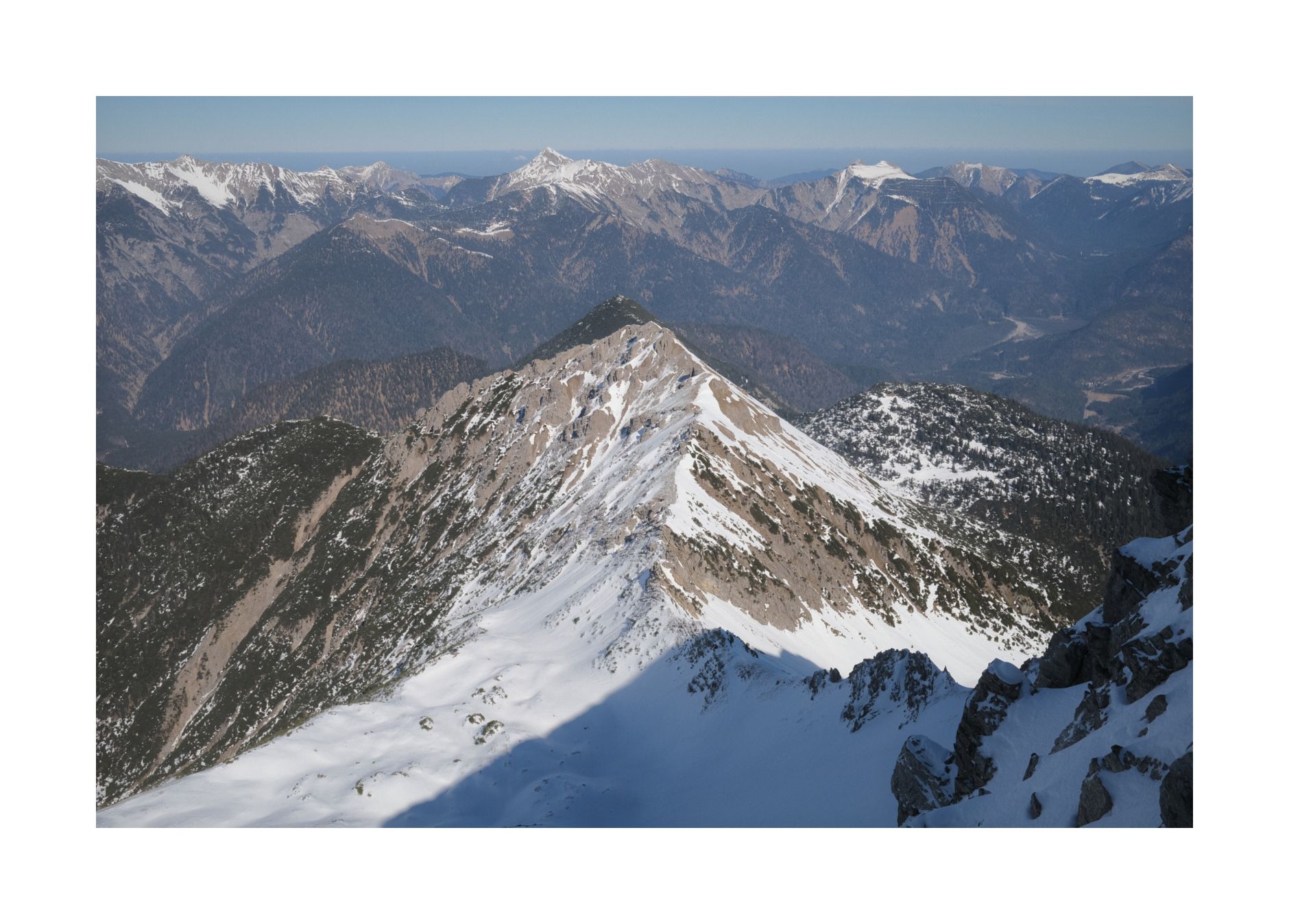 Wir verabschieden uns rasch und ich sprinte auf die Upsspitze. Die kenne ich vom Sommer, aber im Winter ist das noch einmal etwas ganz anderes. Den Ausblick merke ich mir und speichere zur Sicherheit etwas davon auf einer SD-Karte ab. Taumhaft und kalt. Ein Bergläufer sprintet auf Halbschuhen und in kurzen Hosen an mir vorbei. Was bin ich doch bloß für ein Weichei mit Schneeschuhen am Rucksack!