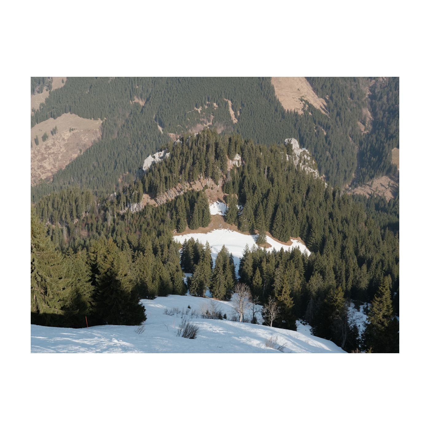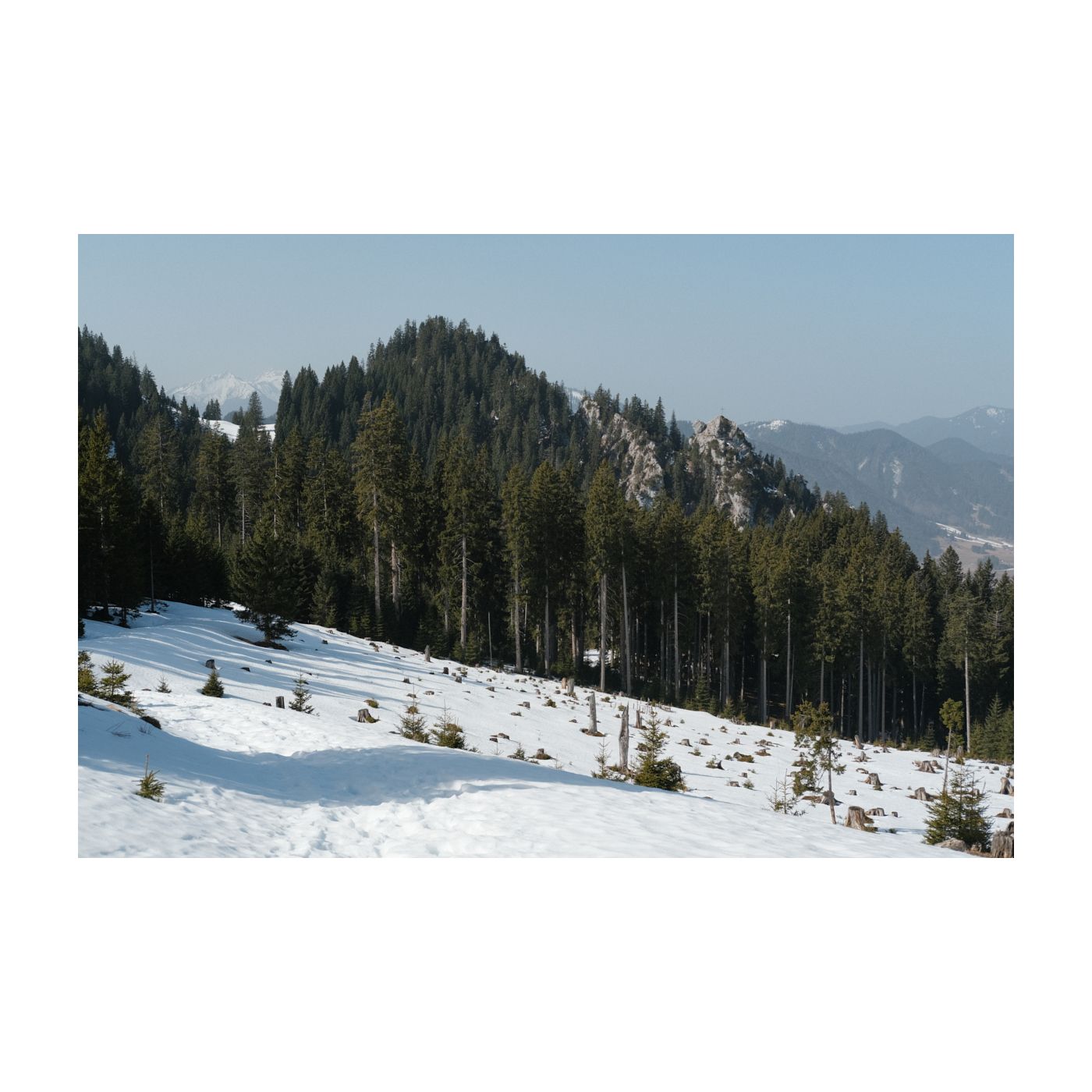 Frisch ist es am Morgen, als ich in das Tal der Grünen Laine einbiege. Immerhin kommt man dort gut voran, da man die allfälligen Eisplatten auf der Forststraße meist bequem am aperen Rand umgehen kann. Der Bärenbadflecken ist so, nach kurzer Seitwärtsbewegung im Wald, bereits nach 45 Minuten erreicht. Ab jetzt ist die Schneedecke jedoch durchgängig geschlossen. Zunächst versuche ich mein Glück noch ohne Hilfsmittel, muss jedoch in einer steileren Passage die Schneeketten (don't call it Grödel) anlegen, um schneller vorwärts zu kommen. Ich habe ja nur vier Stunden Zeit.