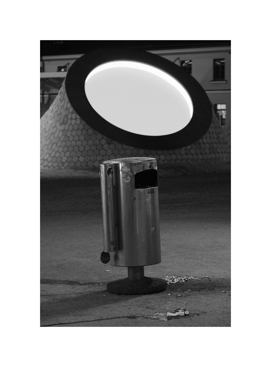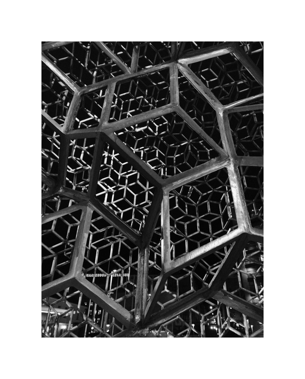 Mitten auf der freien Fläche steht eine eiserne Skulptur. Je näher man herantritt, desto deutlicher werden die filigranen, streng geometrischen Formen. Strenge Geometrie? Mein Gehirn verliert sich in den optischen Täuschungen, die diese Strukturen hervorrufen. Ich fühle mich, als ob ich versuchen würde, die logischen Brüche in einem von Eschers Bildern zu ergründen, ja ich fühle mich als wäre ich Teil eines Escher-Bildes.